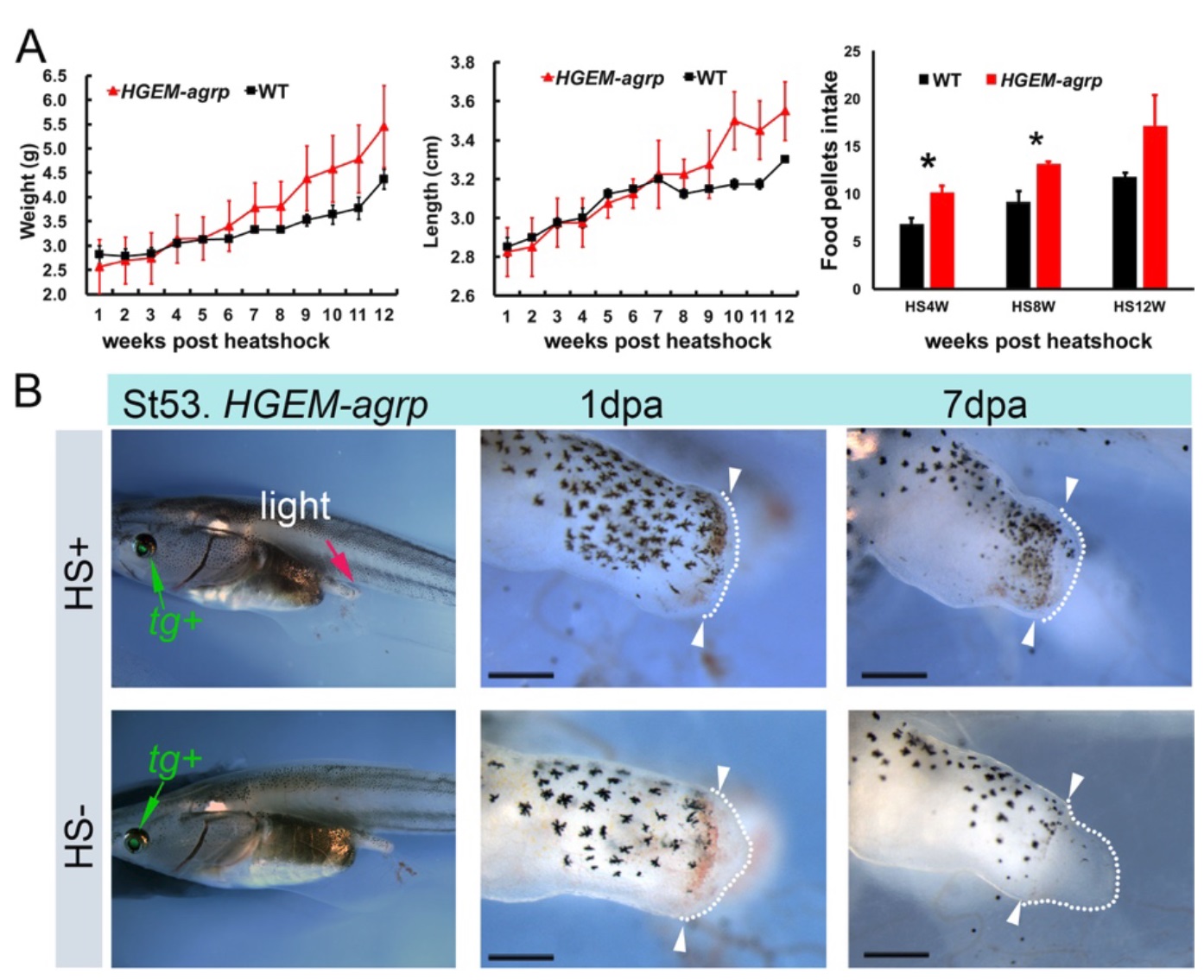 Fig. S3 AgRP inhibits limb regeneration in transgenic Xenopus, Related to Figure 2. (A) Body weight, length and food intake in HGEM-agrp transgenic and wild type (WT) young frogs, after heat shock induction of agrp. HGEM-agrp and wild type animals were heat treated daily in a 34ËC water bath, and their body weight, length (snout-vent), width (hip girth) were measured weekly. Food pellets were provided, and the number of pellets consumed was recorded daily. Error bars: standard derivation, N = 3 (B) Localized light beam heated activation of agrp in transgenic tadpole limb leads to regeneration defects. Transgenic animals have green lens (green arrows). White dotted lines demarcate the edges of regenerating limbs. Scale bars: 0.2 mm. Related to Fig. 2. |