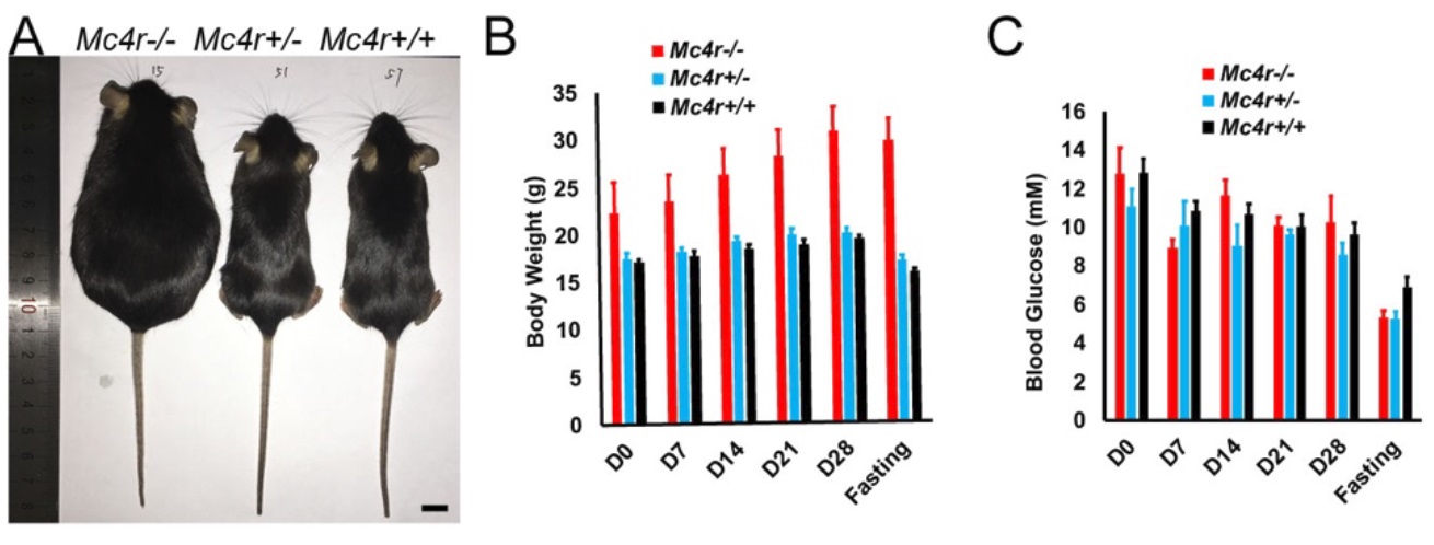Fig. S4 Mc4r mutant mice, Related to Figure 4. (A,B) Mc4r-/- mice developed obesity, with significant gain of body weight after digit tip amputation. (C) Similar levels of blood glucose in mc4r-/-, mc4r+/- and wild type (WT) mice. Tail blood glucose was measured with a Roche Accu-check glucose monitor system. Error bars: standard derivation, N = 4 for each group. Scale bar in (A) 1cm. Related to Fig. 4. |