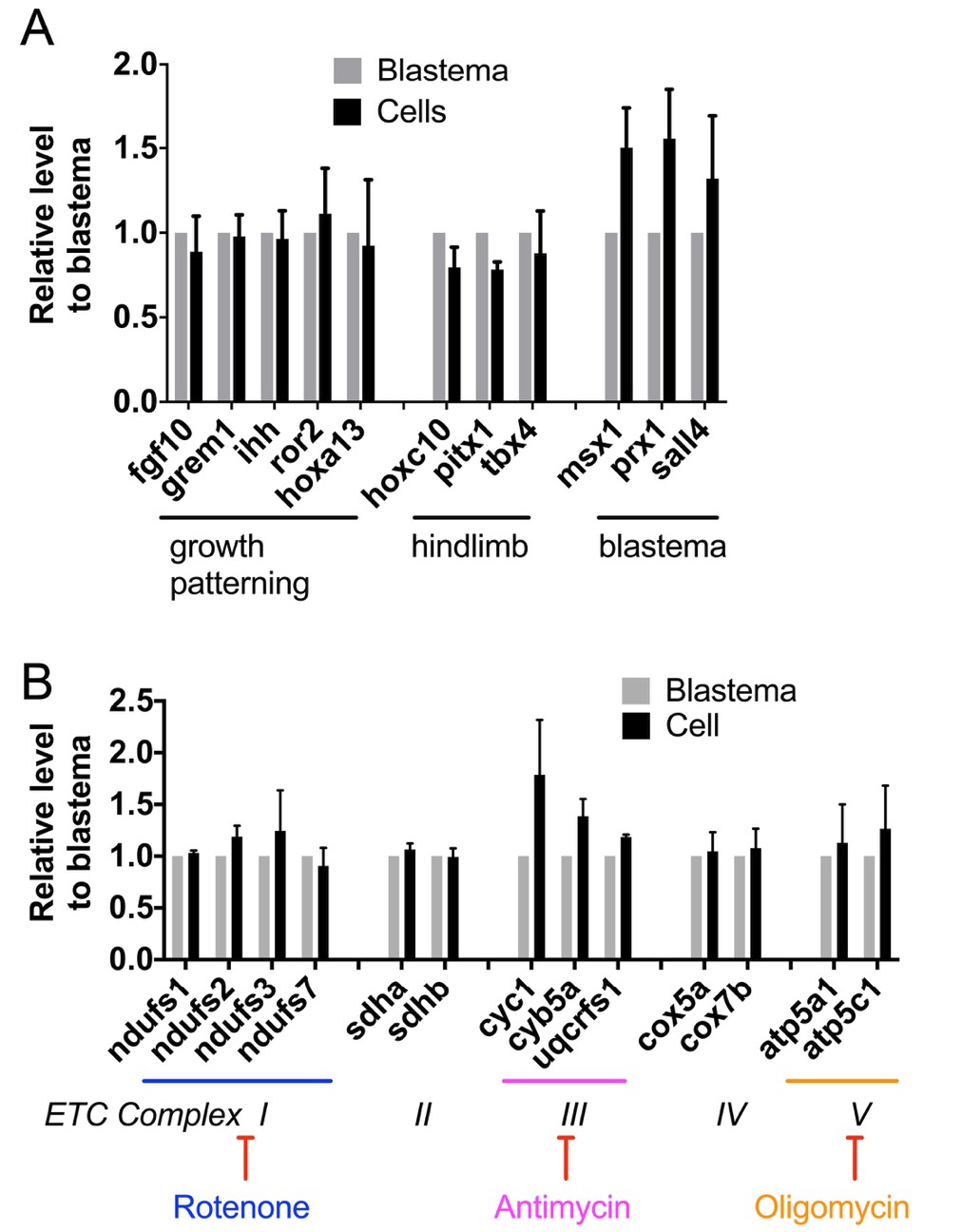 Fig. S6 Comparison of limb blastema and cultured limb blastema cells, Related to Figure 6. (A) Relative expression levels of genes known to function during limb growth and patterning, markers for hindlimb (hoxc10, pitx1, tbx4) and limb blastema (msx1, prx1, sall4). (B) Relative expression levels of genes of complex I-V in the electron transduction chain (ETC) for ATP generation. The compounds Rotenone targets complex I, Antimycin targets complex III, and Oligomycin targets complex V. Gene expression levels are analyzed with real-time PCR, and ratios are calculated, using blastemas as 1.0. Error bars: standard deviation. Data are from three independent experiments. Related to Fig. 6. |