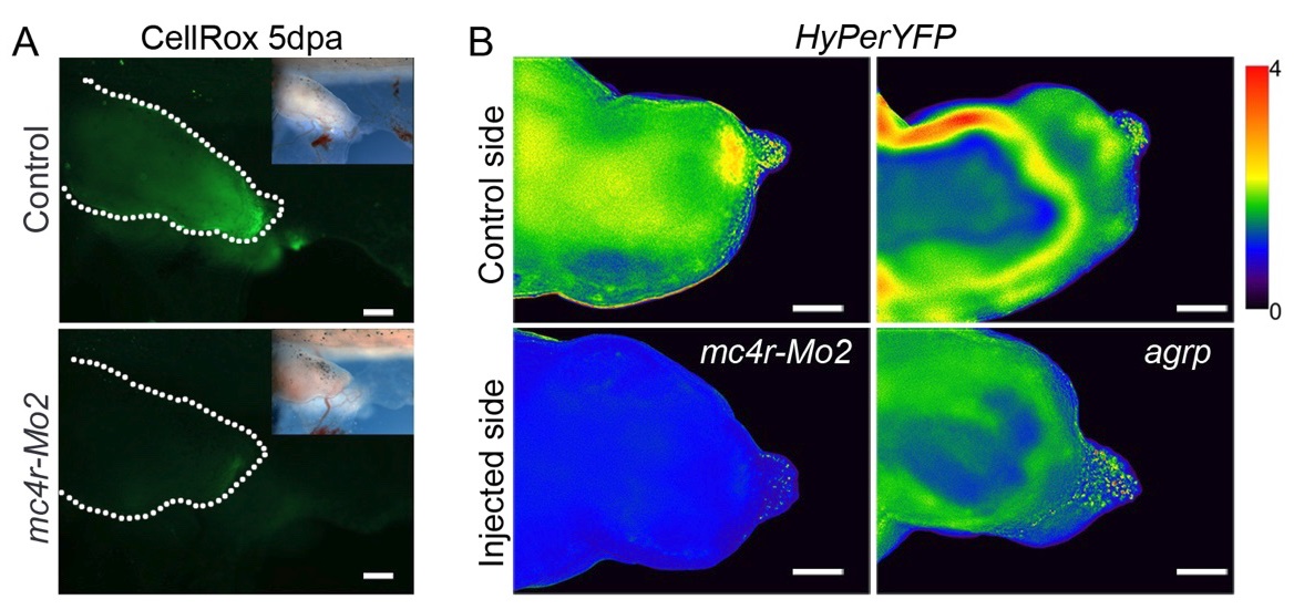 Fig. S7 ROS production in Xenopus tadpole limb stumps, Related to Figure 7. (A) CellRox green staining shows diminished overall oxidative stress signals in mc4r-Mo injected tadpole limb stump, imaged at 5dpa. CellRox signals peak in 5dpa limb blastemas. (B) H2O2 production in agrp and mc4r-Mo injected HyPerYFP tadpole limbs were measured based on excitation ratio of HyPerYFP 490nm/HyPerYFP402 nm, as described in Love et al., Nat Cell Biol 15(2):222-228. Images shown represents typical observations from multiple specimens (N=6). Related to Fig. 7. |