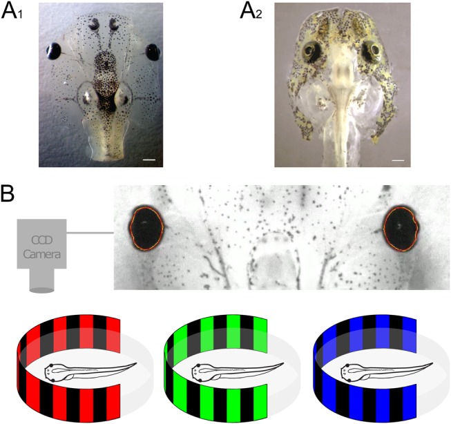 Fig. 1. Behavioral imaging of optokinetic responses in semi-intact amphibian preparations. (A) Images of semi-intact preparations of larval Xenopus: A1 modified from Ramlochansingh et al. (2014) and Axolotl (A2) at stage 53, with intact eyes, eye muscles and central visuo-motor circuits. (B) Schematics of infrared video recordings of the movements of both eyes with a CCD camera during horizontally oscillating vertical color (red, green, blue)-striped patterns projected onto a cylindrical screen (bottom). Scale bars: 1â mm.