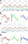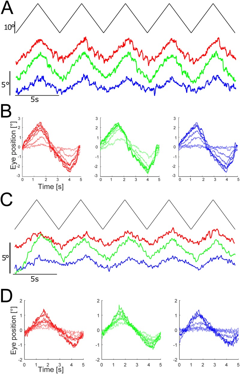 Fig. 2. Color-dependent optokinetic responses of Xenopus and Axolotl larvae. (A,C) Representative examples of horizontal positional oscillations of the lefteye (colored traces) extracted from video sequences during constant velocity oscillations (0.2â Hz; ±10°/s; black trace) of a large-field red-black, green-black and blue-black striped pattern (intensity level 32) in a Xenopus (A) and an Axolotl larvae (C). (B,D) Averaged responses over a single cycle during visual motion stimulation with different color-striped patterns (color coded) at seven selected luminance levels (intensity levels 8, 16, 32, 64, 96, 128, 255) in Xenopus (B) and Axolotl (D) obtained from the responses of the recordings depicted in A and C.