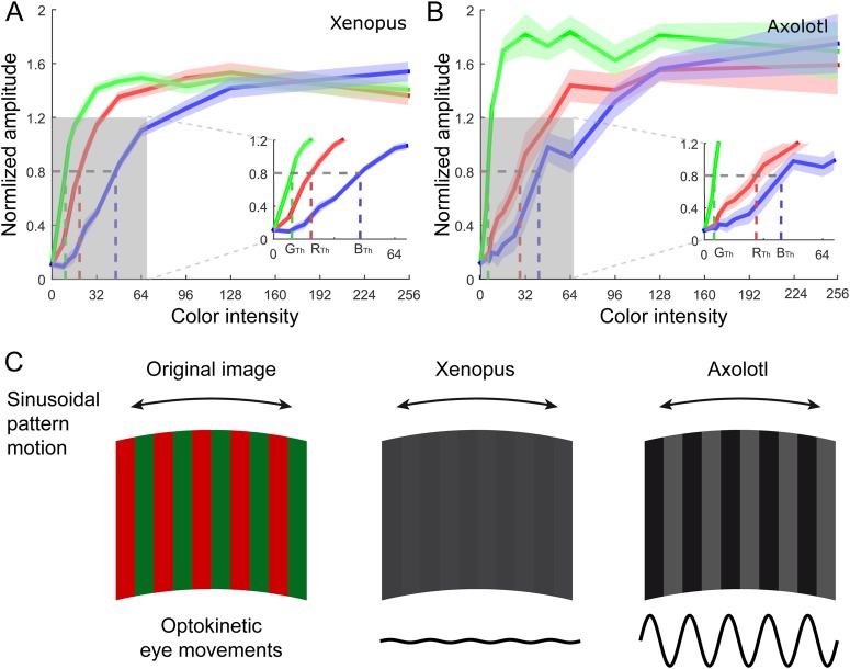 Fig. 3. Amplitude of optokinetic responses during motion stimulation with RGB colors. (A,B) Dependency of normalized eye movement amplitudes during large-field image motion on the intensity of the three primary colors (RGB, color coded) in Xenopus (A, n=12) and Axolotl larvae (B, n=9). Bold lines represent the average and the shaded areas the standard error of the mean. The relative intensities required for an optokinetic response at the threshold level of 0.8 are denoted with RTh, GTh and BTh separately for the three component colors and shown at higher magnification in the insets in A,B. (C) Exemplary red/green-striped image motion pattern (left) and corresponding intensity contrast images that a Xenopus tadpole (middle) and an Axolotl larvae (right) theoretically perceive according to the different color sensitivities depicted in A,B; schematic eye movements (bottom) elicited by horizontal oscillating motion of the colored pattern (double-headed arrows) indicating that the same red/green-striped image evokes different eye motion magnitudes in the two species.