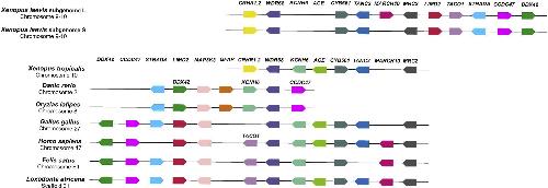 Fig. 3. Analysis of the conserved syntenic regions containing the WDR68 locus in amphibian genome: X. laevis (subgenome L and subgenome S) and X. tropicalis; in fishes: zebrafish and medaka; in birds: chicken; in three species of mammals: human, cat and elephant. Genes are represented by colored boxes while arrow indicates the orientation of the transcription unit. Boxes with the same color represent orthologous genes. Genomic regions were not drawn to scale in order to reduce complexity. (For interpretation of the references to color in this figure legend, the reader is referred to the Web version of this article.)