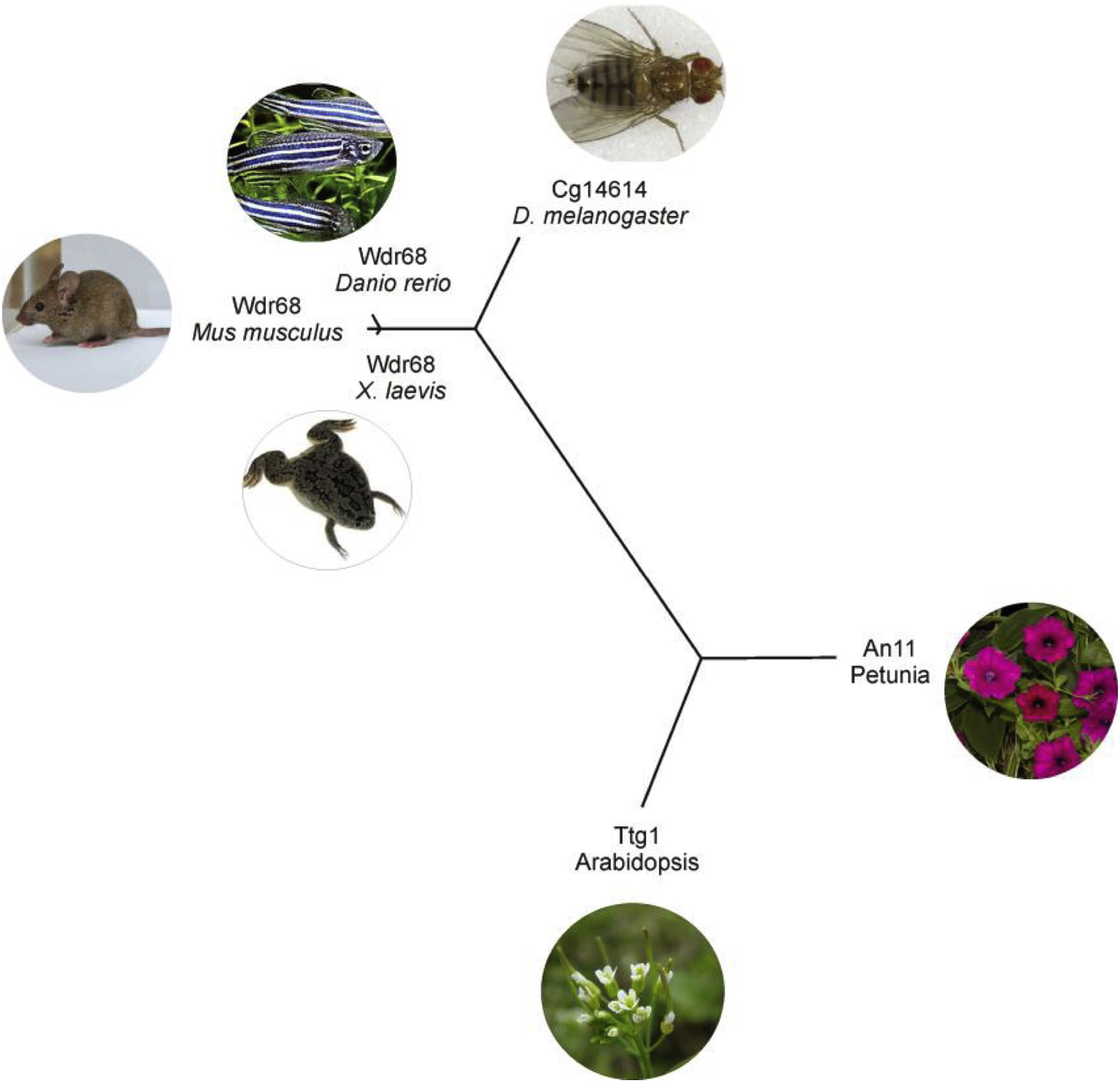 Fig. 1. Unrooted phylogenetic tree showing the molecular relationship between WDR68 homologous proteins from different animals and plants, drawn by the TreeDyn algorithm from the data generated by CLUSTAL OMEGA.