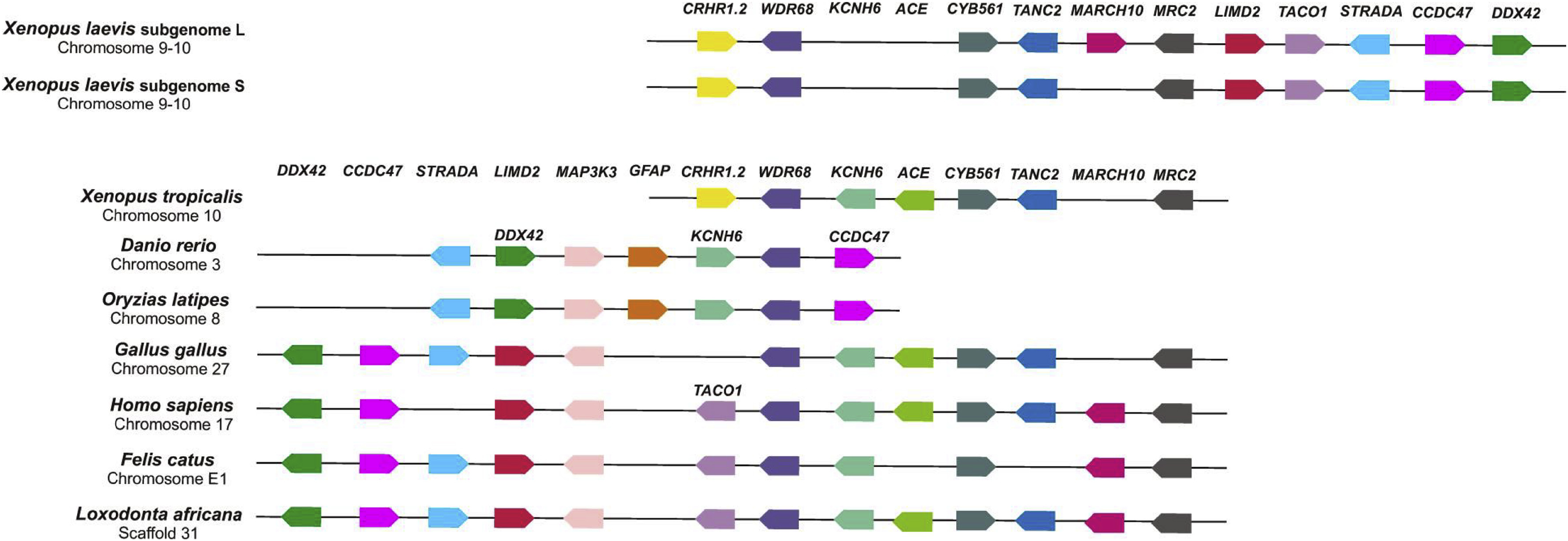 Fig. 3. Analysis of the conserved syntenic regions containing the WDR68 locus in amphibian genome: X. laevis (subgenome L and subgenome S) and X. tropicalis; in fishes: zebrafish and medaka; in birds: chicken; in three species of mammals: human, cat and elephant. Genes are represented by colored boxes while arrow indicates the orientation of the transcription unit. Boxes with the same color represent orthologous genes. Genomic regions were not drawn to scale in order to reduce complexity. (For interpretation of the references to color in this figure legend, the reader is referred to the Web version of this article.)