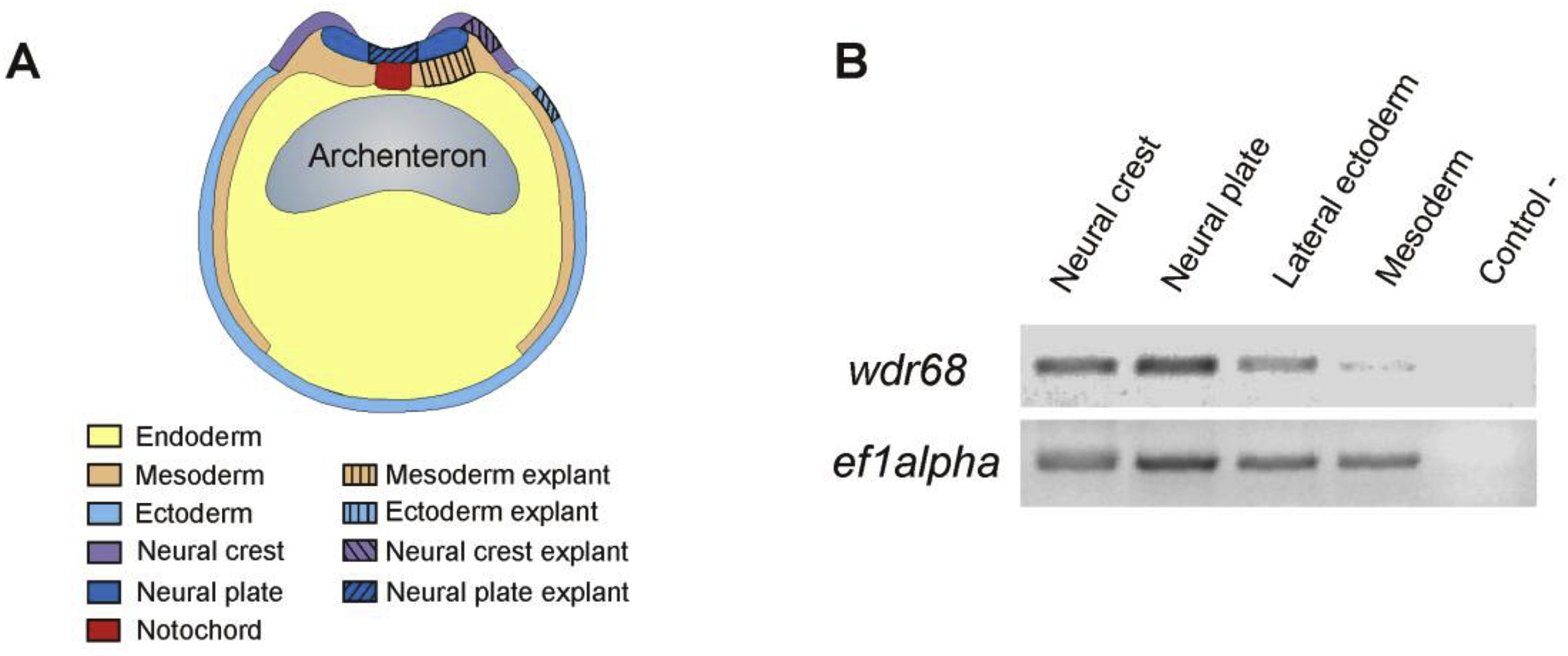 Fig. 6. RT-PCR analysis showing the ubiquitous expression of wdr68 at mid neurula stage. (A) Scheme representing a transverse section of a stage 16 embryo. Explants were dissected from ectodermal tissue, mesoderm, neural plate and neural crest in order to carry out total RNA purification for the subsequent RT-PCR. (B) Semiquantitative PCR showing a similar wdr68 expression level in the three ectodermal domains of neural crest, neural plate and lateral ectoderm. A lower expression was detected in the paraxial mesoderm. A mix without DNA template was used as negative control. Expression of ef1 alpha was used as loading control.