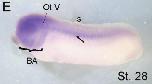 Fig. 4. Expression pattern for the wdr68 gene during Xenopus early development. (A, B) Dorsal view of embryo. (CâF) Side view. (G, H) Transverse sections. (A) wdr68 expression is ubiquitous during early stages of development. (B, C) Since the late neurula stage, there is an enrichment in its expression in the head region (black arrowhead in B), in the migratory streams of the cranial neural crest (black arrowheads in C) and in the developing somites (white arrow). (D) At stage 25, wdr68 transcripts are evident in the otic vesicle. In the somitic region (black arrow), they acquire a segmental pattern. (E, F) Since the tailbud stage, wdr68 is strongly marked in the branchial arches (brackets). (G) Front section at the level of the branchial arches (blue broken line in F). Notice that the ectodermal cell population corresponding to the neural crest expresses wdr68. (H) Transverse section at the trunk level (red broken line in F). wdr68 expression is evident on the floor of the neural tube and in somitic mesoderm. References: BA, branchial arches; CNC, cranial neural crest; Ect, ectoderm; OpV, optic vesicle; OtV, otic vesicle; n, notochord; NC, neural crest; NT, neural tube. (For interpretation of the references to color in this figure legend, the reader is referred to the Web version of this article.)