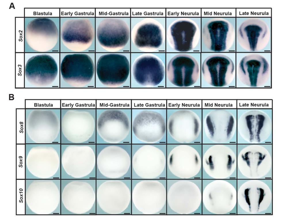 Fig. 1. Expression ofSoxB1 andSoxEfactors inXenopusembryos.(A)In situhybridization examiningSox2andSox3expression in wildtypeXenopusembryos collectedbetween blastula and late neurula stages. (B)In situ hybridization examiningSox8, Sox9,and Sox10 expression in wildtype Xenopus embryos collected between blastula and late neurula stages