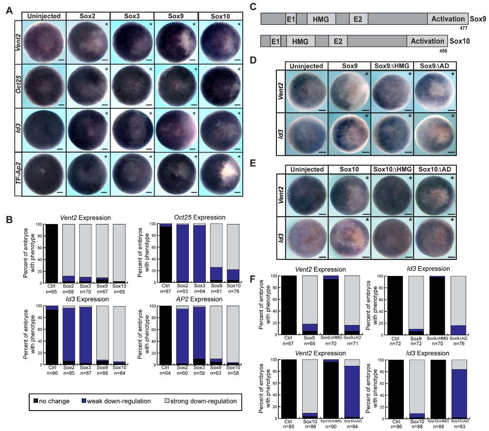 Fig. 2. SoxE factors interference with pluripotency gene expression depends upon DNA-binding capabilities.(A)In situhybridization examiningVent2,Oct25,Id3, andTF-AP2 in blastula stage (stage 9) embryos injected unilaterally with Sox2, Sox3, Sox9 or Sox10. (B) Quantification of phenotypes associated with SoxB1 and SoxE factor overexpression(C) Schematic of Sox9 and Sox10 protein domains. (D)In situ hybridization examining Vent2 and Id3 expression in blastula stage (stage 9) embryos injected unilaterally with wildtype or mutant forms of Sox9. (D)In situ hybridization examining Vent2 and Id3 expression in blastula stage (stage 9) embryos injected unilaterally with wildtype or mutant forms of Sox10. (E)Quantification of phenotypes associated with overexpression of SoxE factors and SoxE functional variants. Asterisk (*) denotes injected side of the embryo as marked by staining of the lineage tracerβ-galactosidase (red) (For interpretation of the references to color in this figure legend, the reader is referred to the web version of this article.)