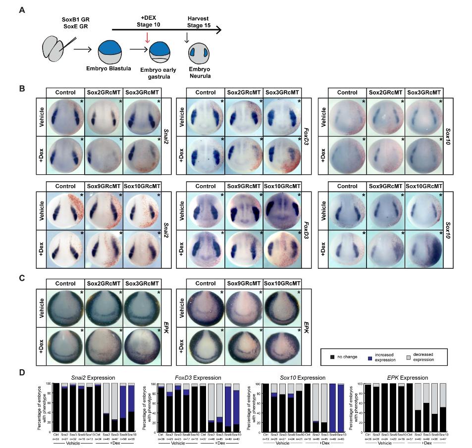 Fig. 3. Inducing SoxB1 and SoxE protein activities at gastrulation leads to differential effects on neural crest formation, but similar effects on the epidermis.(A)Schematic of experimental overview. (B)In situ hybridization assaying expression of neural crest factors Snai2, FoxD3, and Sox10 in neurula (stage 15) embryos injected with inducible Sox2, Sox3, Sox9, or Sox10 constructs. (C)In situ hybridization assaying the expression of epidermal factor EPKin neurula (stage 15) embryos injected with inducible Sox2, Sox3, Sox9, or Sox10 constructs. (D) Quantification of phenotypes associated with overexpression of inducible SoxB1 and SoxE factors. Asterisk (*) denotes injected side of the embryo as marked by staining of the lineage tracer β-galactosidase (red). (For interpretation of the references to color in this figure legend, the reader is referred to the web version of this article.)