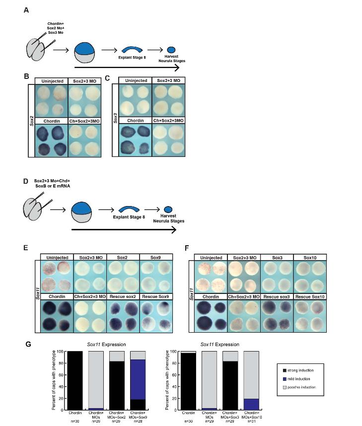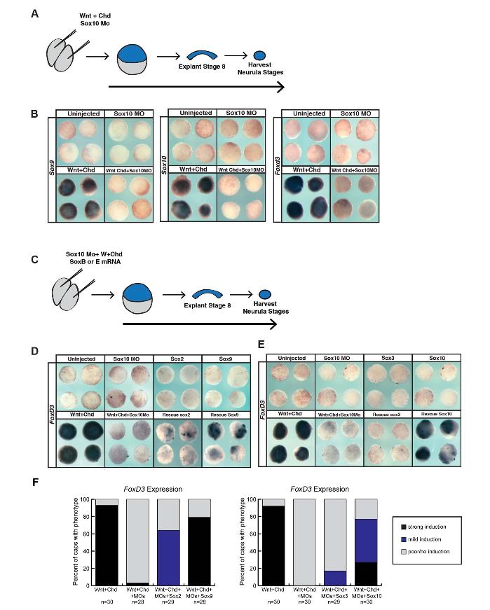 Fig. 7. SoxB1 factors cannot replace the function of SoxE factors in animal pole explants induced to a neural crest state.(A) Schematic of experimental overview for knockdown experiments. (B)In situ hybridization examining Sox9, Sox10,or FoxD3 expression in animal pole explants injected with Sox10 morpholino, Wnt8, and chordin. (C)Schematic of experimental overview for rescue experiments. (D)In situ hybridization examining FoxD3 expression in animal pole explants injected with Sox10 morpholino, Wnt8,chordin, and either Sox2 or Sox9 mRNA. (E)In situ hybridization examining FoxD3 expression in animal pole explants injected with Sox10 morpholino, Wnt8, chordin, and either Sox3or Sox10 mRNA. (F) Quantification of induction potential following SoxB1 and SoxE factor overexpression in morphant animal caps.