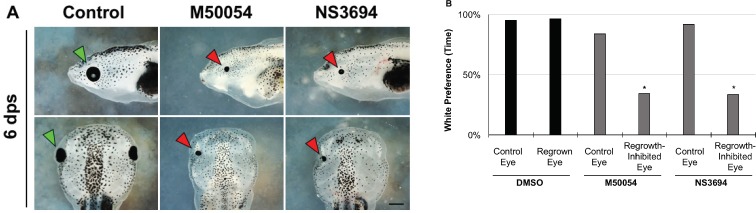 Figure 1. Restoration of visual function requires eye regrowth.(A) Representative images showing effects on eye regrowth after apoptosis inhibitor treatments (M50054 or NS3694) at 6 days post surgery (dps) as compared to a DMSO-vehicle control (n = 12 per condition). Green arrowhead indicates a DMSO-treated regrowing eye. Red arrowheads indicate regrowth-inhibited eyes. To assay for visual function of a single eye, the right contralateral eye was removed for all conditions (shown in bottom middle and right panels). Top panels: dorsal is up, and anterior is to the left. Bottom panels: anterior is up. Scale bar: 500 µm. (B) DMSO-treated tadpoles with either one normal or one regrown eye display white background preference. Tadpoles with an uninjured eye treated with an apoptosis inhibitor also showed white background preference (n = 12 per condition, P> 0.05). Tadpoles with a regrowth-inhibited eye resulting from treatment with an apoptosis inhibitor lost white background preference (n = 12 per condition, *P < 0.01).
