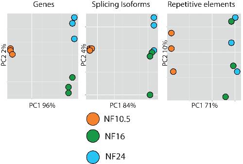 Figure 8. Prognostic value of AC transcriptomes. Principal component analysis of the AC samples for transcript classes indicated on top. Each dot represents a single biological replicate, each color represents a stage. On the X and Y-axis are plotted the first and second principal components. NF10.5 separates always very well from the other two stages. The transcriptomes of NF16 and 24 can be resolved mainly by gene expression and to less extent by RNA splicing. |