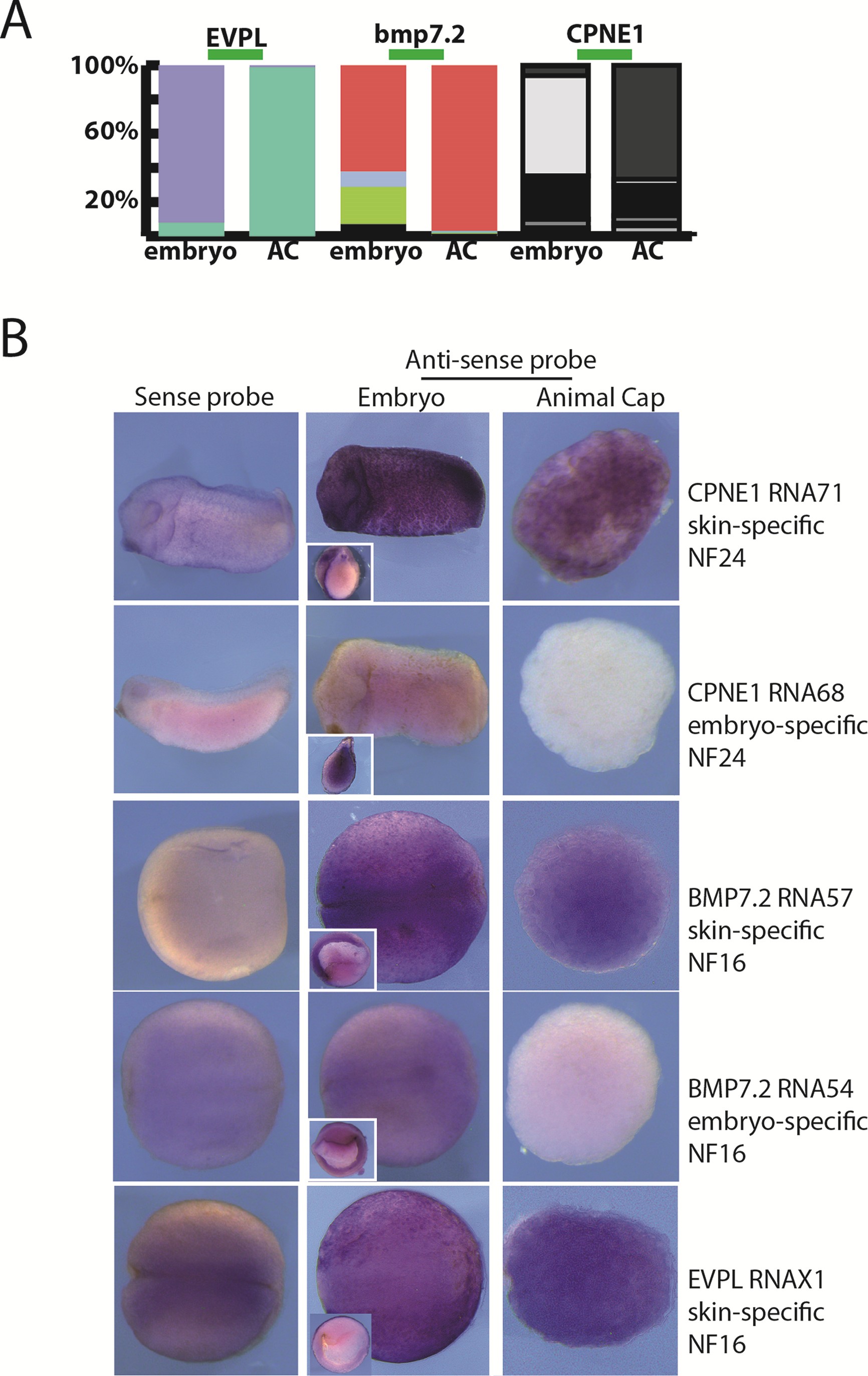 Figure 4. Spatial expression patterns of embryonic and epidermal RNA splicing isoforms. (A) Representations of the variety of splicing isoforms expressed in the ACs or in whole embryo for the indicated genes. (B) RNA in situ hybridizations for age-matched embryos and ACs at indicated stages, hybridized either with the skin specific splicing isoform probes (CPNE1 RNA0071, BMP7.2 RNA13257 and EVPL X1) or with the embryo-specific isoform probes (CPNE1 RNA0068, BMP7.2 RNA13254). Genes were picked from Supplementary Table S7; bmp7.2 is not on the list, since ACs and embryo share the same prevalent isoform. It was nevertheless chosen because of the importance of BMP signaling in ectodermal cell fate choice. Inserts show embryos hemisectioned prior to hybridization. Staining reactions have been conducted in parallel for each row. |