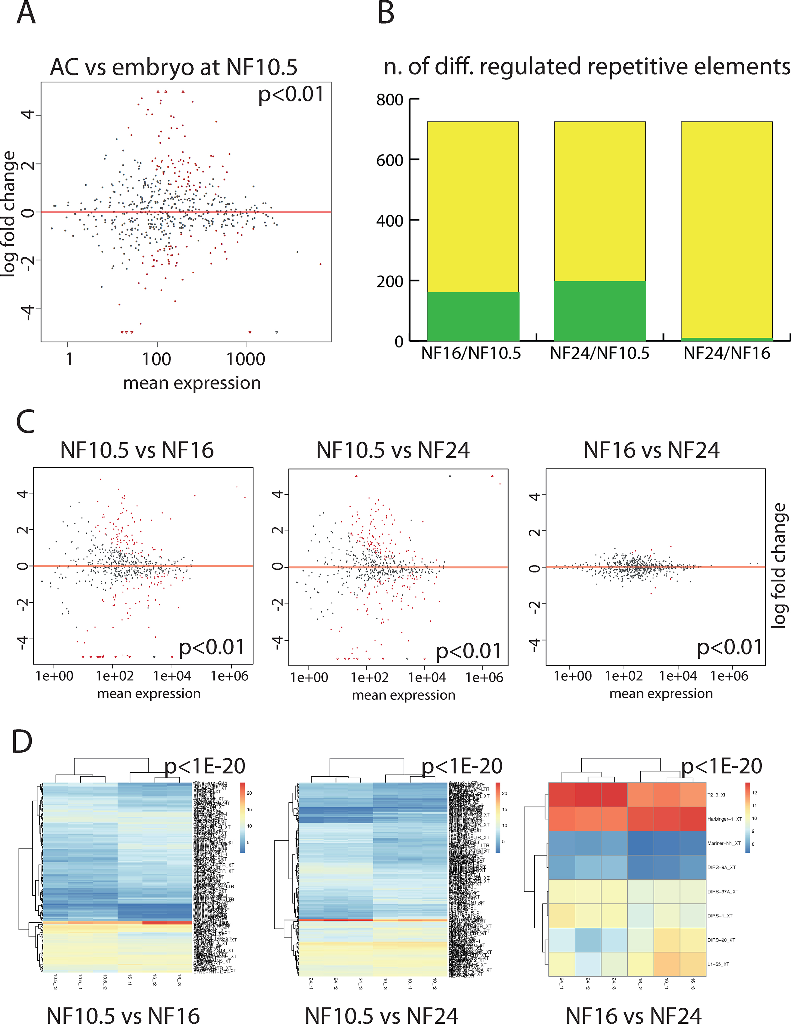 Figure 5. Transcripts from repetitive DNA elements during epidermal differentiation. ( A) Expression of RE transcripts in the AC vs whole embryo at the gastrula stage (NF10.5). Each dot represents an annotated RE transcript. RE RNAs that are differentially expressed in a significant manner (P < 0.01) are shown in red, while transcripts with not-significant variation are shown in gray. (B) Plotting the extent of differentially expressed RE-derived transcripts in AC. Green: differentially regulated RE RNAs between the given developmental stages (P < 0.01). Yellow: the maximal number defined by REPBASE 19.10. (C) Scatter plots detailing the extent and magnitude of differential RE expression between indicated developmental stages (P < 0.01). D) Unsupervised clustering of the differentially expressed RE transcripts from the biological replicates with a cutoff of P < 1eâ20. |