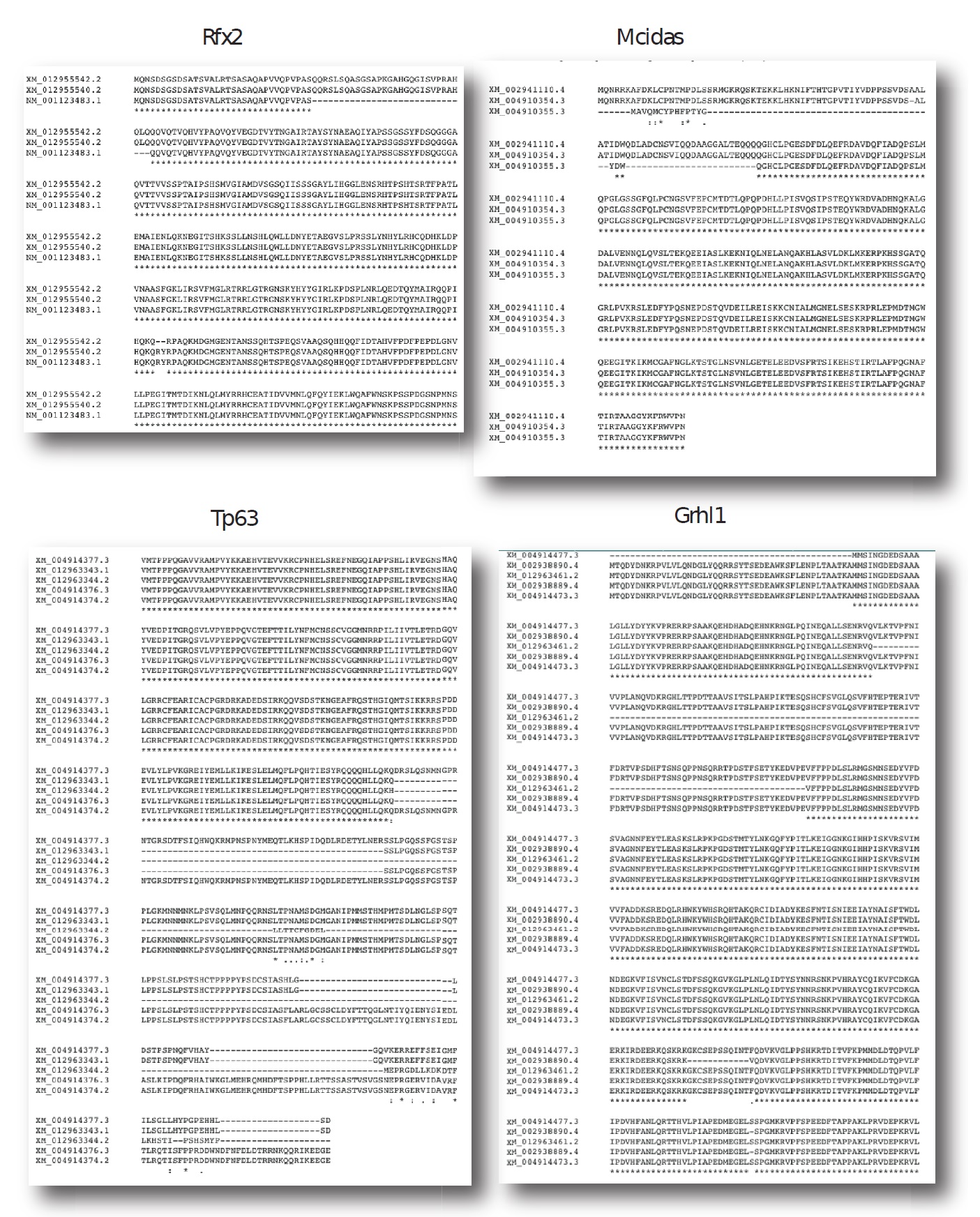 coding sequence of selected splice variants for rfx2, mcidas, tp63 and grhl1,