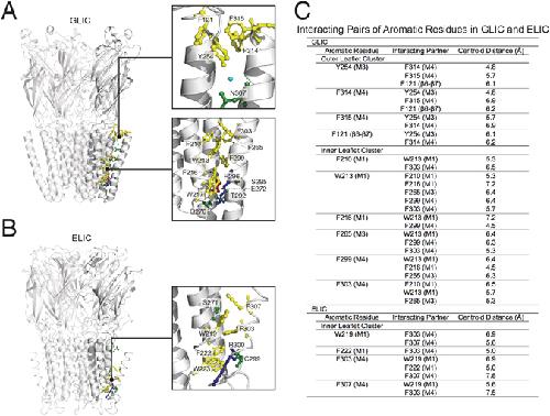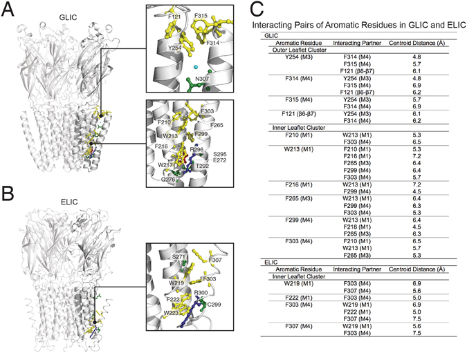 Figure 1. Side chain chemistry at the M4-M1/M3 interfaces of GLIC and ELIC. Structures of (A) GLIC (PDB: 4HFI) and (B) ELIC (B, PDB: 2VL0) showing on the left the full structure. The boxes on the right show the highlighted regions of GLIC and ELIC. Residues are coloured depending on their properties, aromatic (yellow), hydrogen bonding (green), negatively charged (red) and positively charged (blue). A water molecule in GLICâs M4-M1/M3 interface is also shown (cyan). Note that aliphatic residues are not shown for clarity. (C) The centroid distances between interacting pairs of aromatic residues at the M4-M1/M3 interfaces of GLIC and ELIC.