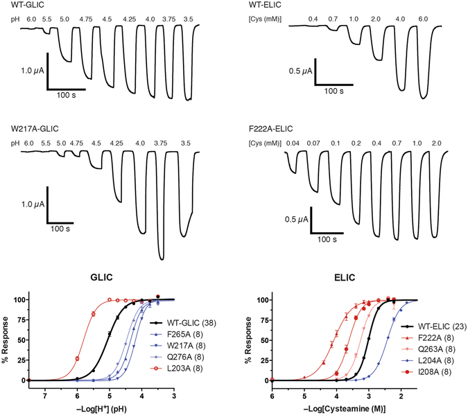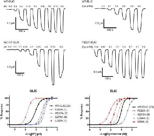 Figure 2. Functional characterization of the GLIC and ELIC mutants. Whole cell electrophysiological traces were recorded using two-electrode voltage clamp electrophysiology. Currents were recorded from Xenopus laevis oocytes expressing either GLIC (Left panel) or ELIC (Right panel) in response to protons or cysteamine, respectively. The lower panels presents dose response curves (normalized current (I/Imax) versus ligand concentration) for select Ala mutants, with the number (n) of averaged traces. Error bars represent S.E.