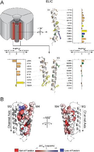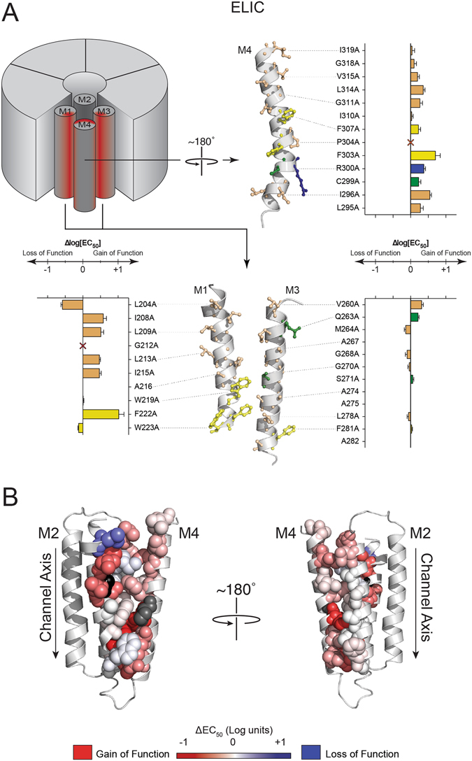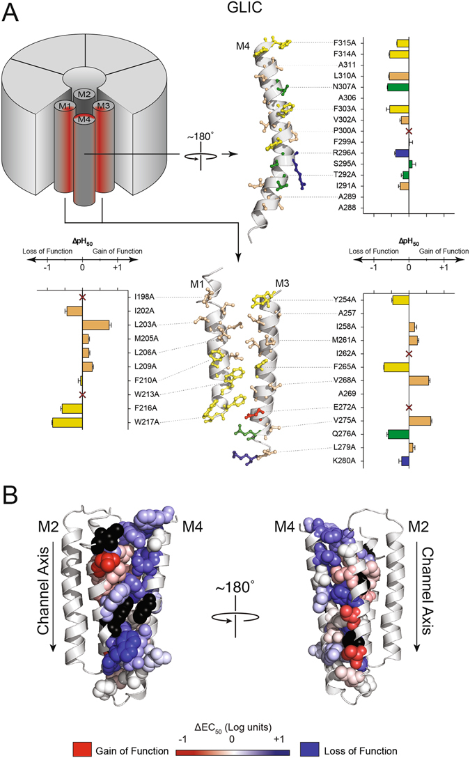 Figure 4. Functional effects of Ala mutations at the M4-M1/M3 interface in ELIC. (A) Changes in the âlog(EC50) resulting from Ala mutations of residues on M4 (top right panel), M1 (bottom left) and M3 (bottom right). Residues and bar graphs are colour-coded as in Fig. 3. The bar graphs represent the magnitude of changeâ±âthe standard deviation. (B) Changes in the âlog(EC50) values are heat-mapped onto an ELIC homology model (based on GLIC structure). The magnitude of the shift in pH50 is depicted via colour intensity, as in Fig. 3. P304A mutant is coloured grey, due to altered desensitization kinetics.