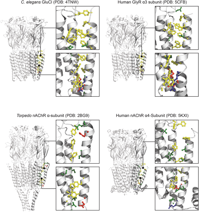 Figure 5. The M4-M1/M3 interface of different pLGICs. Structures of GluCl (top left, PDB: 4TNW), GlyR (top right, PDB: 5CFB), nAChR (bottom left, PDB: 2BG9), and α4β2 (bottom right, PDB: 5KXI). Each structure shows a zoomed in region of the M4-M1/M3 interface of a single subunit. Residues are coloured depending on their properties: aromatic (yellow), hydrogen bonding (green), negatively charged (red) and positively charged (blue).