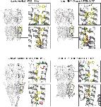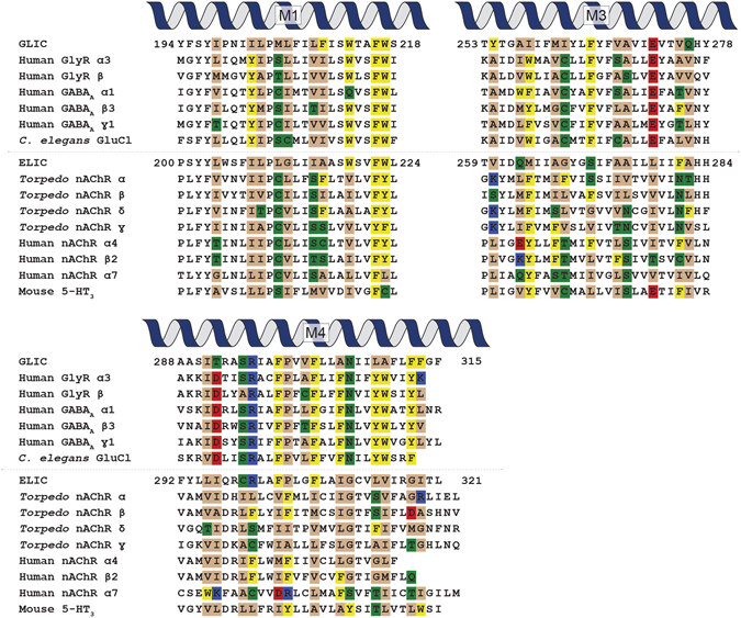 Figure 6. Sequence alignments for M1, M3 and M4 in a number of pLGICs. Residues facing the M4-M1/M3 interface are highlighted and colored depending on their properties: aromatic (yellow), hydrogen bonding (green), negatively charged (red) and positively charged (blue).