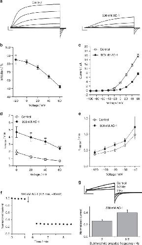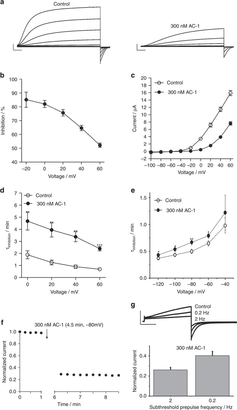 Figure 2. AC-1 alters activation kinetics and shifts voltage-dependence of activation.(a) Example of Kv7.1/KCNE1 current traces recorded before and after application of 300ânM AC-1. Currents were elicited with 10âs pulses to potentials of â100âmV to +60âmV, applied in 20âmV increments from a holding potential of â80âmV. Tail currents were recorded at â120âmV (scale bars indicate 2âμA, 1âs). (b) Voltage dependence of AC-1 inhibition determined as percent change of current amplitude after application of 300ânM AC-1 (n=15,±s.e.m.). (c) Rates of current activation are slowed in the presence of 300ânM AC-1. Activation was described using a single exponential function. Ïactivation was plotted against the test potential (n=5, ±s.e.m.; Student's t-test; **P<0.01, ***P<0.001). (d) AC-1 shifts the voltage dependence of channel activation to more positive potentials. Macoscopic currents analysed at the end of test pulses and plotted against their respective test potential. (n=15, ±s.e.m.; Student's t-test). (e) Currents were activated by a 5âs depolarizing pulse to â20âmV. Tail currents were recorded at different test potentials ranging from â140âmV to â40âmV, applied in 20âmV increments. 300ânM AC-1 decreases the rate of current deactivation measured by fitting traces to a single exponential function to determine Ïdeactivation (n=7â9, ±s.e.m.; Student's t-test). (f) Channels were held in closed state during application of 300ânM AC-1 by clamping the oocyte to â80âmV for 4.5âmin without pulsing. On re-initiation of pulsing to +40âmV, the inhibition of current magnitude was fully developed, indicating that AC-1 is able to access its binding site when channels are in the closed state. (g) Channels were activated by 5âsec 0âmV pulses to obtain a control value. Subsequently, 300ânM AC-1 were applied and channels were preconditioned for 1âmin by 300 msec â40âmV -subthreshold prepulsing at 2 and 0.2âHz (scale bars indicate 1âμA, 1âs). At the end of preconditioning channels were activated again by 5âs 0âmV pulses and the current amplitudes at the end of the activating pulse were normalized to the control value (n=8, ±s.e.m.; Student's t-test). |