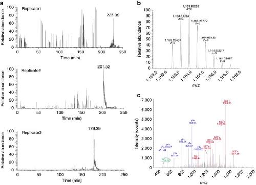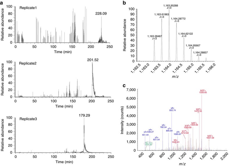 Figure 6. MS/MS-analysis.(a) Extracted ion chromatograms of the triply charged species of the KCNE1 peptide 42LEALYVLMVLGFFGFFTLGIMLSYIR67 with AC-10 modification (1163.28âm/z) identified across three replicate LC-MS/MS analyses. Isotope pattern of the [M+3H]3+ precursor of AC-10 modified peptide 42LEALYVLMVLGFFGFFTLGIMLSYIR67 (b) and corresponding MS/MS spectra with b- (red) and y-ion annotation (blue) (c). The characteristic marker ion of AC-10 (459.39m/z) is observed in the MS/MS spectrum. The consecutive y-ion series y2ây9 of respective amino acids is nicely displayed. |
