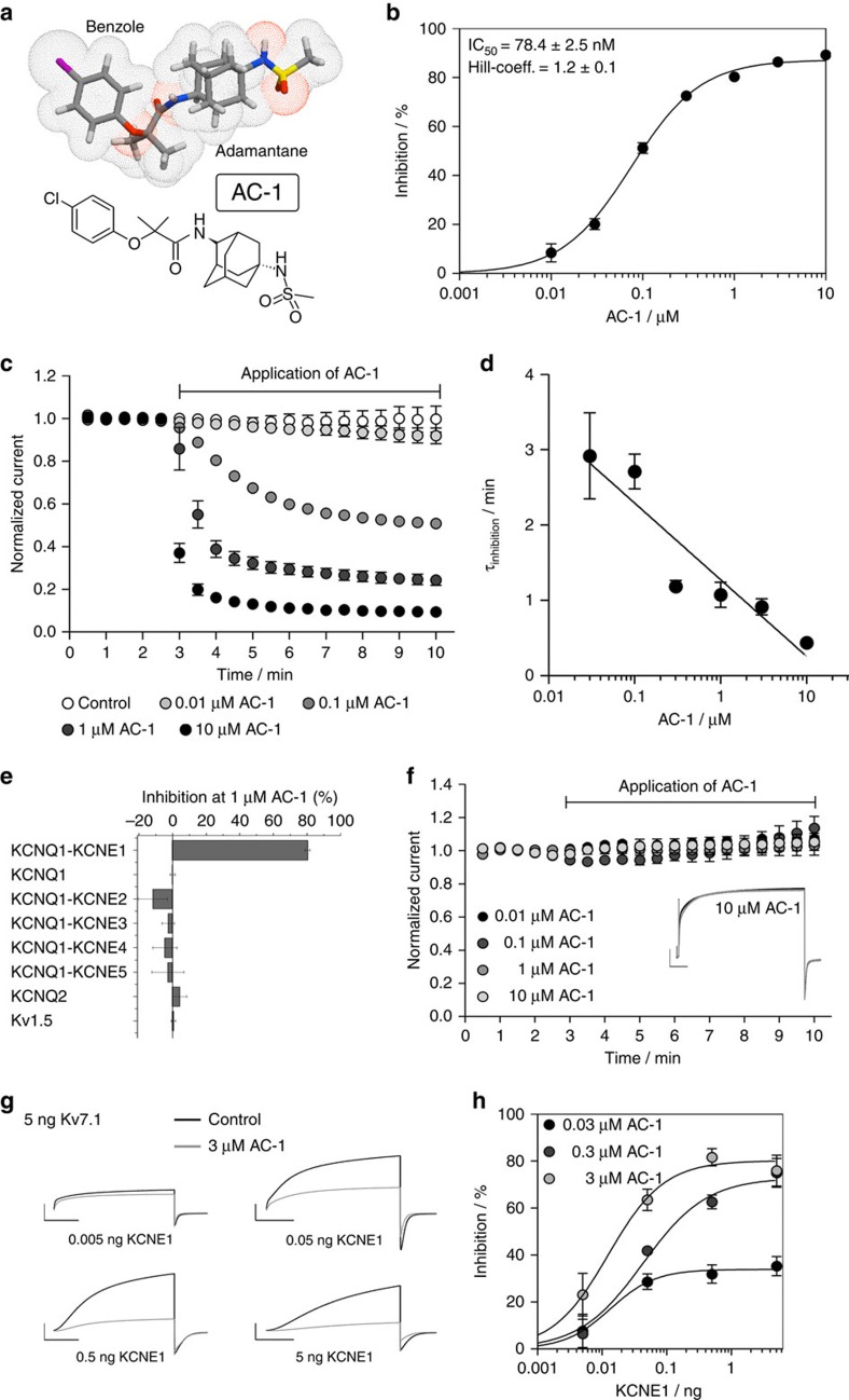 Figure 1. AC-1 inhibits Kv7.1 channels only in the presence of KCNE1.(a) Structure of adamantane compound AC-1. (b) Concentration-response relationship for inhibition of Kv7.1/KCNE channel currents by AC-1. Kv7.1/KCNE1 channel currents were activated by repetitive 7âs pulses to +40âmV applied from a holding potential of â80âmV. Inhibition was determined as percent change in current amplitude at the end of the depolarizing test pulse to +40âmV. Data were fitted (smooth curve) to the Hill equation (n=5â70,±s.e.m.). (c) The inhibitory effect of different AC-1 concentrations on Kv7.1/KCNE1 channels was determined by repetitive 7âs pulses to +40âmV applied from a holding potential of â80âmV. Current amplitudes at the end of the depolarizing test pulse were normalized to initial values and plotted against time (n=3â5, ±s.e.m.). (d) The onset of inhibition was described using a single exponential function and the time constant Ïinhibition was plotted against the respective AC-1 concentration. This relationship could be described using a linear function with m=â1.02±0.19 (n=3â5, ±s.e.m.). (e) Lack of 1âμM AC-1 inhibition of Kv7.1, Kv7.1/KCNE2â5, Kv7.2 and Kv1.5. (f) Lack of effect of different AC-1 concentrations on Kv7.1 homotetramers (n=3â5, ±s.e.m.). Example of homomeric Kv7.1 channel currents before (black) and after application (grey) of 10âμM AC-1 shown in the inlay. Currents were elicited by 7âs test pulses to +40âmV (scale bars indicate 1âμA, 1âs). (g) Inhibitory effects of 3âμM AC-1 on Kv7.1/KCNE1 channels is dependent on the level of KCNE1 expression. Currents were elicited as described in panel c (scale bars indicate 2âμA, 2âs). (h) The effect of variable KCNE1 expression on the sensitivity of Kv7.1 channels to three concentrations of AC-1. Inhibition of current was determined as described above and plotted against the amount (in ng) of cRNA injected into individual oocytes. Relationships were fitted using the Hill equation (smooth curves, n=3, ±s.e.m.). |