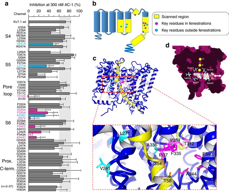 Figure 3. Putative binding mode of AC-1.(a) Inhibition of wt and mutant Kv7.1/KCNE1 channels by 300ânM AC-1. Influence of amino acid exchange (yellow) on channel sensitivity to 300ânM AC-1 was investigated using alanine scanning combined with TEVC. Inhibition was determined as percent change in current amplitude at the end of a depolarizing test pulse (n=4â57, ±s.e.m.; one way analysis of variance, Dunnett's post hoc test; ***P<0.001). (b) Cartoon of a single Kv7.1 channel subunit with scanned region in yellow. The circles indicate positions of mutations that significantly alter AC-1 sensitivity (key residues). Magenta filled circles indicate residues that face into the fenestration and blue filled circles mark residues that do not face fenestrations. (c) A preopen closed state model of Kv7.1/KCNE1 (Kv7.1 colored blue, KCNE1 colored yellow) with key residues highlighted in magenta (fenestration facing), blue non-fenestration facing and orange (fenestration facing in KCNE1). (d) Molecular docking of AC-1 to a homology model of Kv7.1/KCNE1 (ref. 33). AC-1 was positioned in close proximity to the amino acid residues identified by alanine scanning. AC-1 is located in a fenestration, which is only formed in the presence of KCNE1 (ref. 35). |