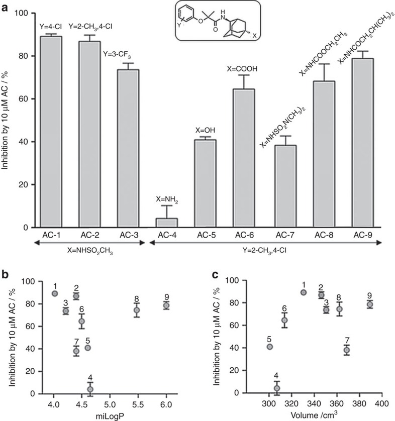 Figure 4. Structure activity relationship of adamantane compounds.(a) Inhibitory effect of different AC derivatives (10 μM) on Kv7.1/KCNE1 channels. Chemical modifications at both ends of AC-1 were investigated as indicated. Inhibition was determined as percent change in current amplitude at the end of a depolarizing test pulse to +40 mV (n=3–5, ±s.e.m.). (b) Lack of correlation between inhibitory effect and hydrophobicity of AC compounds (n=3–5, ±s.e.m.). (c) Lack of correlation between inhibitory effect and volume of AC derivatives (n=3–5, ±s.e.m.). miLog P values and volume were calculated using Property Calculator (Molinspiration Cheminformatics). |