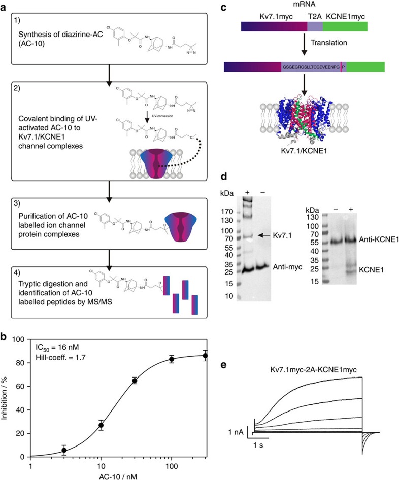 Figure 5. PAL-based approach to identify AC binding site.(a) Schematic view of the PAL-based approach to investigate the binding site of AC-1. (b) Concentration-response curve for AC-10, the UV-active diazirine derivate of AC-1. The inhibitory effect of AC-10 was determined in CHO cells stably expressing Kv7.1/KCNE1. Inhibition was determined as percent change in current amplitude at the end of the depolarizing test pulse to +40âmV (±s.e.m.). (c) A new cDNA-construct (Kv7.1myc-2A-KCNE1myc in pXOOM) allows for functional expression of myc-tagged Kv7.1 and KCNE1 in HEK293T cells. In this construct, cDNAs of Kv7.1 and KCNE1 are linked via the T2A peptide sequence, which mediates co-translational protein cleavage42. (d) Western blot analysis of affinity purified Kv7.1 and KCNE1 proteins. Kv7.1myc was purified using myc-agarose beads KCNE1 was purified using anti-KCNE1 coupled protein-A-sepharose beads (right). In both western blots, â+' indicates transfected cells, ââ' indicates non-transfected control cells. Antibodies used for affinity purification are detected in â+' and ââ'. Additional protein bands proved the expression of Kv7.1 and KCNE1 proteins. It should be noted, that KCNE1, as a myc-tagged protein, should also be purified using the myc-agarose beads. Since the respective KCNE1 band is of comparable size to the anti-myc band, it is not possible to distinguish between them. Thus, KCNE1 expression was instead proven using the KCNE1 antibody. (e) Functional expression of Kv7.1myc-2A-KCNE1myc in HEK293T cells (scale bars indicate 1ânA, 1âs). |