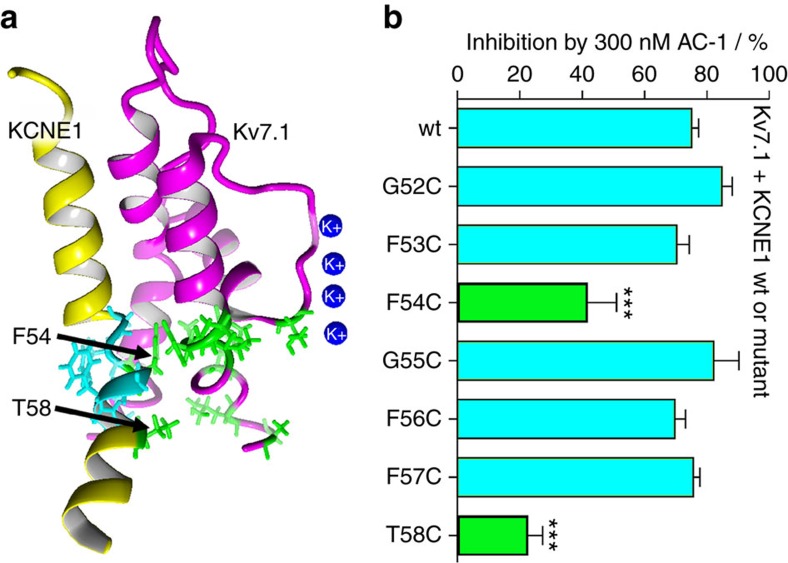 Figure 7. Single point mutagenesis of the transmembrane region of KCNE1.(a) Location of the transmembrane region of KCNE1 (KCNE1-TM) in a Kv7.1/KCNE1 channel complex. (b) Inhibition of Kv7.1/KCNE1 channel complexes by 300ânM AC-1. Single point mutations were introduced as indicated and inhibition was determined as percent change in current amplitude at the end of a depolarizing test pulse to +40âmV (n=3â5, ±s.e.m.; one-way analysis of variance, Dunnet's post hoc test; ***P<0.001). |