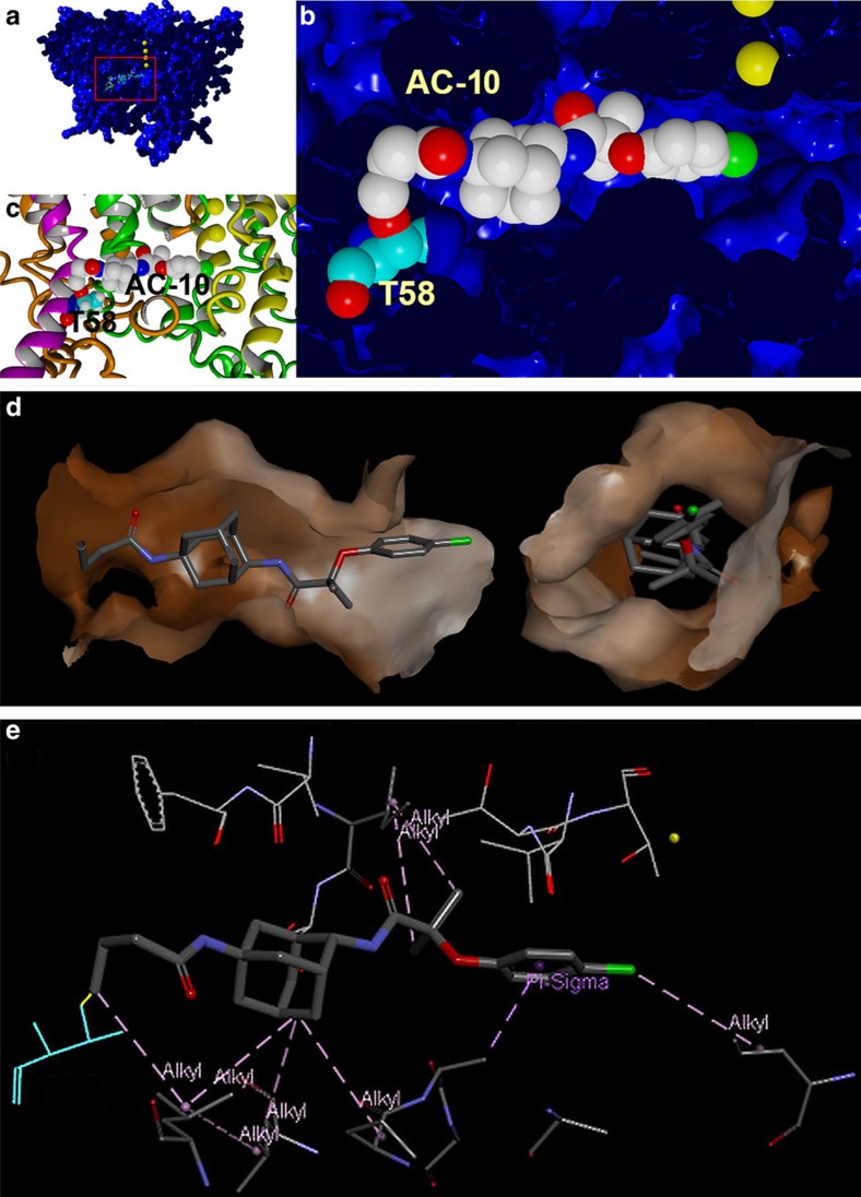 Figure 8. Constrained docking of AC-10 to Kv7.1 channel.(a) AC-10 carbene docked by constraining the distance (2 ±1âà ) to the KCNE1 Thr58 side chain. The energy minimized model complex is shown. Kv7.1/KCNE1 was surface rendered, cut in the middle and colored blue, KCNE1 Thr58 is presented in ball-representation and CPK color coding with carbons in cyan. Compound AC-10 is shown in ball-representation and standard CPK color coding. K+-ions are shown as yellow spheres. (b) Close-up of AC-10 in its binding pocket. (c) Close-up representation of similar region, but with protein shown as ribbons (KCNE1 in magenta, Kv7.1 subunits in yellow green orange). (d) The AC binding site is formed by several residues that surround a tunnel-like structure (fenestration) that bridges the inner cavity (left) and the membrane (right). The surface lining the fenestration is hydrophobic, especially in the region around the adamantine of AC-1. (e) The specific ligand-receptor interactions determined using Discovery Studio 4.0. are: six alkyl interactions (pink), one alkyl-pi interaction (pink) and one carbon interaction (green). |