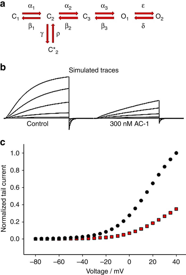 Figure 9. Markov state modelling of AC-1 inhibition.Markov state modelling was used to simulate current traces under control and 300ânM AC-1. The state model as indicated in a was used. The rate constants (in sâ1) had the following voltage dependence (Ï=VF/RT) (where V is the membrane voltage, F Faraday's constant, R the gas constant and T absolute temperature): α1=exp(0.47 Ï); β1=0.2 à exp(â0.35 Ï); α2=0.46 à exp(0.47 Ï); β2=3.3 à exp(â0.35 Ï); α3=24 à exp(0.06 Ï); β3=19 à exp(â0.007 Ï); É=4.6 à exp(0.8 Ï); δ=1.4 à exp(â0.7 Ï); γ=10. For unbound channels Ï=10, and for AC-1 bound channels Ï=0.1. The voltage protocol used to simulate the traces shown in the figure was: holding potential â80âmV, steps from â40 to +60âmV in 20âmV steps for 5âs, tail potential â120âmV. Simulated traces are shown in (b). Simulated normalized peak inward tail currents at â120âmV are plotted as a function of the prepulse potential (5âs pulses, control in black and AC-1 in red circles c). |