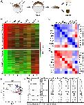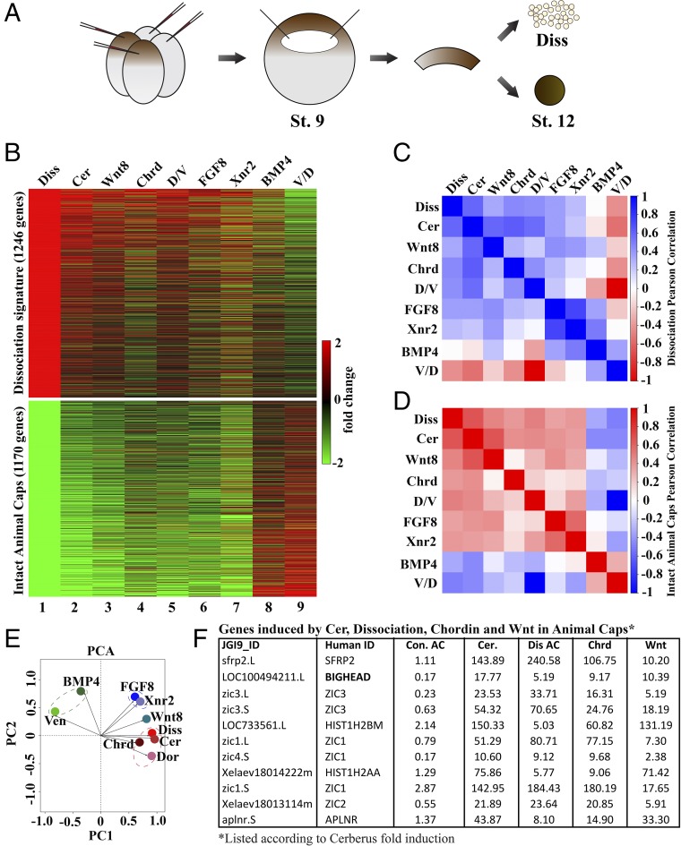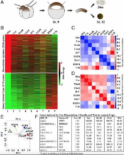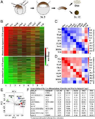 Fig. 1. Transcriptome analysis of stage 12 animal cap explants. (A) Illustration of mRNA injection four-cell and animal cap excision at stage (St.) 9. Animal caps were cultured until St. 12 and collected for RNA-seq with or without cell dissociation (Diss). (B) Heat map showing fold changes of the cell dissociation and atypical epidermis signatures. Atypical epidermis corresponds to uninjected animal caps cut at stage 9 and cultured until stage 12; these controls and the dissociated cells correspond to experiment 1 shown in Dataset S1 and are from the same experiment. These gene signatures were also compared with Cerberus, Wnt8, Chordin, FGF8, or BMP4 mRNA-injected animal caps, or with D/V half-embryos derived from the same clutch of embryos. V/D, ventral/dorsal. Rows and columns were left unclustered. Note that many genes induced by dissociation were induced in all conditions, except for BMP4 mRNA-injected animal caps and ventral halves. Genes in the atypical epidermis signature were only induced by BMP4 injection and in ventral halves. A correlation matrix of the animal cap dissociation (C) and atypical epidermis signatures in the RNA-seq libraries (D) are shown. Correlation scores were calculated as Pearson correlation coefficients and color-coded as shown in the scale bar on the right of the panel. These results show that the animal cap signatures obtained via RNA-seq readily distinguish neural- and epidermal-inducing conditions. (E) Dissociation signature examined via PCA to analyze dimensionality in nine experimental conditions (BMP/con AC, Ven/Dor, FGF8/con AC, Xnr2/con AC, Wnt8/con AC, Cer/con AC, Diss/con, Dor/Ven, and Chrd/con AC). AC, animal cap; con, control; Dor, dorsal; Ven, ventral. Each axis represents a principal component (PC1 and PC2), with the first one showing the most variation. PCA clustered epidermal-forming conditions (Ven and BMP), neural-inducing conditions (Diss, Cer, Chrd, and D/V), and mesoderm-forming conditions (FGF8 and Xnr2) without systemic bias. Note that epidermal and dissociation conditions lie on opposing quadrants, indicating the greatest differences. (F) Table of genes induced by Cer mRNA, dissociation, Chrd mRNA, and Wnt mRNA in animal caps listed according to Cerberus fold induction. Because Bighead was induced in all neuralizing conditions and ranked second in the list, it was chosen for further analysis. |