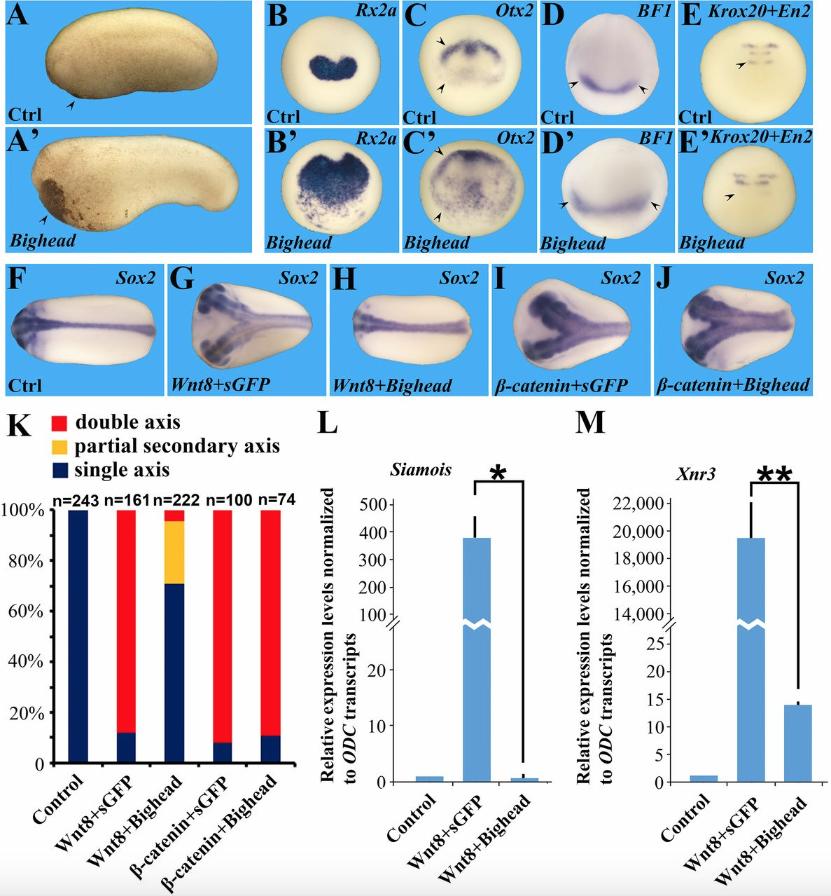 Fig 3 Bighead promotes head formation and is a Wnt antagonist. Embryos were injected four times into the animal pole with 800 pg of Bighead mRNA at the four-cell stage. All embryo pictures were taken at 25à magnification. (A and Aâ²) Bighead mRNA injection enlarges the head and cement gland at the tail bud stage; arrowheads indicate the cement gland. Ctrl, control. (BâDâ²) In situ hybridizations showing that Bighead mRNA injection expands Rx2a (88%, n = 35), Otx2 (93%, n = 28), and BF1/FoxG1 (79%, n = 48); arrowheads delimit the extent of expansion. (E and Eâ²) Wnt target gene En2 (arrowhead) at the midbrain-hindbrain border is inhibited by Bighead, whereas Krox20 marking rhombomeres 3 and 5 remains largely unaffected (92%, n = 50). (FâJ) Coinjection of Bighead mRNA inhibited xWnt8 mRNA ectopic axis-inducing activity, but not β-catenin mRNA activity, in axial duplication assays. Embryos were injected at the four-cell stage into a ventral-vegetal cell with the indicated mRNAs and collected for in situ hybridization for Sox2 at the tail bud stage. The following doses of mRNA were used: 1 pg of xWnt8, 500 pg of sGFP (a secreted form of GFP without phenotypic activity) or 500 pg of Bighead, and 80 pg of β-catenin. (K) Quantification of the experiments shown in FâJ; n indicates the number of embryos analyzed for each experimental condition. (L and M) Bighead inhibits xWnt8-induced Siamois and Xnr3 expression. Embryos were injected into the animal pole with 8 pg of xWnt8 mRNA with or without 800 pg of sGFP or Bighead mRNA into four cells at the four-cell stage. Animal caps were dissected at stage 9 and processed for RT-qPCR for the early Wnt targets Siamois (L) and Xnr3 (M). Note that Bighead significantly inhibits both Wnt targets; the experiment was performed in triplicate (*P < 0.05; **P < 0.01). |