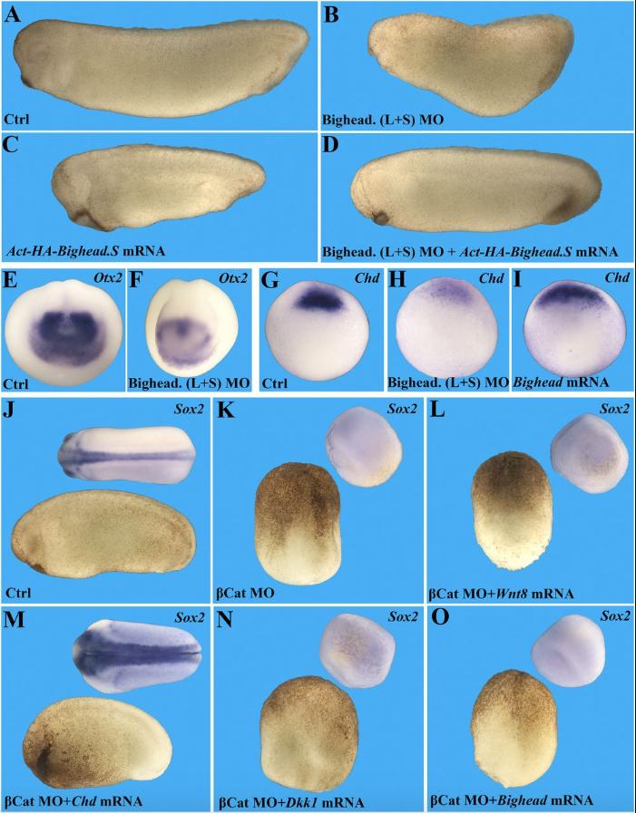 Fig. 4. Bighead is required for head development in a BMP-independent way. All embryo pictures were taken at 25à magnification. (AâD) Bighead knockdown inhibits head formation, which is rescued by coinjection of MO-resistant Bighead mRNA. Embryos were injected two times dorsal-marginal at the four-cell stage as indicated and collected at the tailbud stage. The dosages for MO and mRNA were as follows: 32 ng of Bighead (L+S) MOs (directed against the L and S Bighead genes) and 800 pg of Act-HA-Bighead.S mRNA. Numbers of embryos analyzed were as follows: Controls (Ctrl), n = 153, 100% normal; Bighead MOs, n = 122, 93% with a small head phenotype; MO-resistant HA-Bighead mRNA, n = 109, 95% with a dorsalized phenotype; rescue by coinjection of MO and Bighead mRNA, n = 94, 87% rescued. (E and F) In situ hybridization for Otx2 confirming that Bighead knockdown inhibits forebrain development. Embryos were injected two times dorsal-marginal at the four-cell stage with 32 ng of Bighead MO and collected at stage 15. Ctrl, n = 35, 100% normal; Bighead mRNA, n = 48, 83% with enlarged brain phenotype. (G) Expression of the organizer marker chordin at gastrula stage 10.5. (H) Chordin expression was decreased by Bighead MOs. (I) Chordin expression was increased by injection of 800 pg of Bighead mRNA into the animal pole. Note the reduction of Chordin by Bighead MO (n = 34, 100% with phenotype) and expansion of Chordin by Bighead mRNA (n = 47, 93% with increased chordin). (JâO) Experiments with β-cateninâdepleted embryos demonstrating that Bighead is not a BMP antagonist but, instead, behaves as a Wnt antagonist. (K) Embryos were injected with 24 ng of β-catenin MO four times into the marginal-vegetal region at the two-cell stage. Then, at the four-cell stage, one dorsal-marginal cell was injected with 1 pg of xWnt8 mRNA (L), 100 pg of Chordin mRNA (M), 50 pg of Dkk1 mRNA (N), or 400 pg of Bighead mRNA (O). Embryos were collected for in situ hybridization with the neural marker Sox2 at stage 18. Note that β-catenin MO completely ventralized embryos and that only the BMP antagonist Chordin could rescue an axis. xWnt8 mRNA was entirely inactive in β-cateninâdepleted embryos, as were Dkk1 and Bighead. Numbers of embryos analyzed were as follows: J, n = 47, 100%; K, n = 52, 100% with a ventralized phenotype; L, n = 29, 100% ventralized; M, n = 34, 92% with rescued CNS; N, n = 29, 97% ventralized; O, n = 32, 97% completely ventralized. |