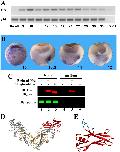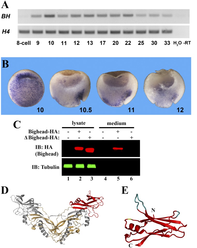Fig. 2. Bighead is a Spemann organizer-secreted protein. (A) RT-PCR assay showing Bighead (BH) expression across different developmental stages. Histone 4 (H4) was used as a loading control. H2O and âRT served as negative controls. (B) In-situ hybridization of Bighead shows its prominent localization in the Spemann organizer in stage 10 whole embryos and stage 10.5â12 hemisected embryos. Note that there is prominent pan-endodermal localization, particularly in nuclei of the superficial yolk plug region. Embryo pictures were taken at 25à magnification. (C) Wild-type Bighead was secreted into the culture medium by transfected HEK293T cells (lane 5), while a mutant Bighead (ÎBighead) lacking the signal peptide was not (lane 6). Tubulin served as a loading control. IB, immunoblot. (D) Crystal structure of myostatin/GDF8 dimer (38), showing in red the C-terminal part of one of its prodomains that may share structural similarities with Bighead. The amino-terminal part of the myostatin prodomain is shown in gray, and the mature growth factor dimer is shown in yellow. (E) Close-up view of the conserved pro-myostatin structural domain, showing that the deletions (cyan) and insertions (yellow) found in Bighead homologs (Dataset S4) fall within loops without perturbing the β-sheet and α-helical structures. |