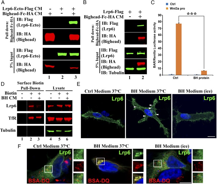 Fig. 5. Bighead binds to Lrp6 and promotes its endocytosis. (A) Bighead bound to the Lrp6 extracellular domain. CM for a secreted form of LRP6 ectodomain-Flag and Bighead-Fc-HA was allowed to bind as indicated, and subjected to protein A/G agarose pull-down followed by immunoblotting (IB). Total protein expression in the CM was confirmed by IB of the input. (B) Bighead also bound to full-length Lrp6. HEK293T cells transfected with full-length Lrp6-Flag were incubated with control or Bighead-Fc-HA CM for 3 h, and cell lysates were subjected to protein A/G agarose pull-down followed by IB. Total protein expression in the lysate was confirmed by IB of 5% of the input. Tubulin served as a cell lysate loading control. (C) Bighead (BH) protein inhibits Wnt3a protein-induced β-cateninâactivated reporter (BAR) reporter expression. HEK293T BAR-Luc/Renilla stably transfected cells were pretreated with or without BH-Fc-HA affinity-purified protein for 6 h, and 100 ng/mL Wnt3a protein was then added to the CM. Cells were further cultured for 16 h, and Luciferase/Renilla activity was measured. The experiment was performed in triplicate, and data are represented as the mean ± SD after normalization to Renilla activity (***P < 0.005). Ctrl, control. (D) BH treatment reduces cell-surface levels of endogenous Lrp6. HEK293T cells were treated with control or BH CM for 1 h at 37 °C, and endogenous cell surface proteins were labeled with sulfo-NHS-SS-Biotin on ice for 30 min. Cell lysates were subjected to pulldown with Streptavidin-agarose beads followed by IB. Total protein expression in the lysate was confirmed by IB of the input. Transferrin Receptor (TfR) was used as a control receptor that is recycled independent of the Wnt pathway. Tubulin served as a loading control. Note that BH reduced cell surface Lrp6, but not TfR (compare lanes 2 and 3). The dashed line indicates noncontiguous lanes. (E) BH induces LRP6 endocytosis. HeLa cells transfected with LRP6-Flag were treated with Ctrl or BH CM for 1 h at 4 °C or 37 °C as indicated, and processed for immunofluorescence. Arrowheads indicate internalized Lrp6+ vesicles. Note that BH induced Lrp6+ vesicles at 37 °C, but not at 4 °C. Another Lrp6 endocytosis experiment is presented in SI Appendix, Fig. S6D. (Scale bar: 20 μm.) (F) BH induces Lrp6 internalization into endolysosomes. HeLa cells transfected with LRP6-Flag were preincubated with BSA-DQ. Cells were then treated with Ctrl or BH CM for 1 h at 37 °C or 4 °C as indicated. Cells were processed for immunofluorescence. (Scale bar: 20 μm.) Squared areas are shown in individual channels as enlarged Insets (1.5à digital enlargement) on the right of each immunofluorescence panel. Note that Lrp6 was endocytosed into lysosomes containing BSA-DQ internalized from the culture medium and that Lrp6 vesicles were eliminated on ice, which prevents endocytosis. |