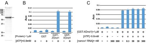 Figure 3. xDnd1 possesses ATPase activity. A. GST-xDnd1 purified protein (arrow) visualized by Coomassie blue staining. B. Comparison of ATPase activity between recombinant GST-xDnd1 and GST-zDnd1 proteins in the presence and absence of ATP. The zebrafish Dnd1 protein served as a positive control. C. ATPase activity of GST-xDnd1 is not stimulated by nanos1 RNA. Analysis based on at least three independent experiments and shown as histograms.