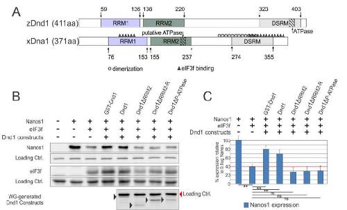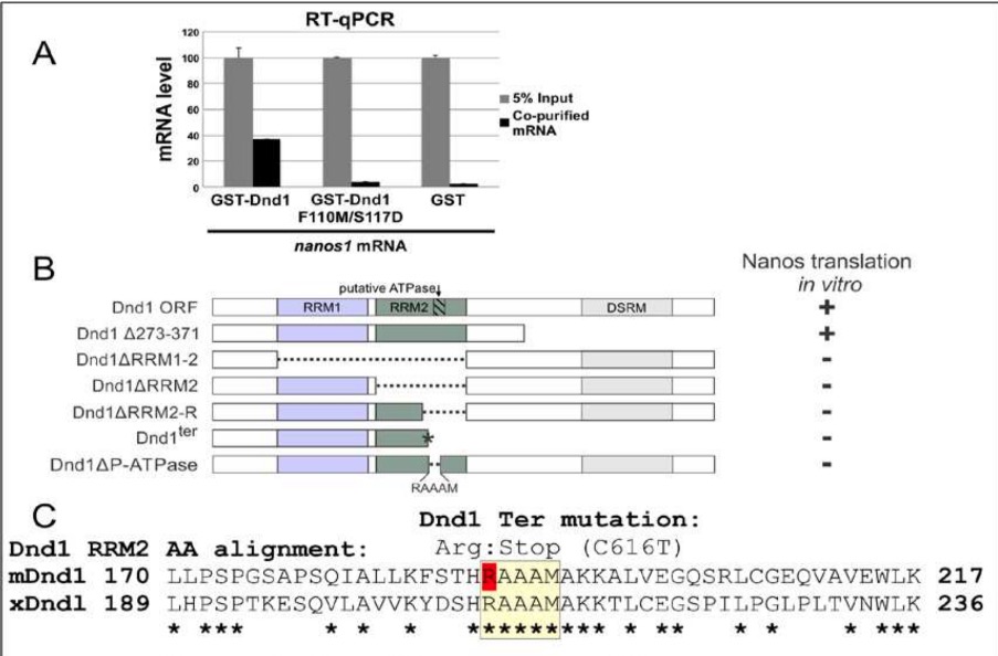 Figure 1. Dnd1 RRM1 and RRM2 are required for binding and translation of nanos1 RNA respectively. A. RRM1 of Dnd1 protein is required to bind to nanos1 mRNA. mRNAs were pulled down by recombinant GST-Dnd1 or GST-Dnd1-F110M/S117D proteins in an in vitro RIP assay and bound mRNA measured by qPCR. Ratio between the pulldown mRNAs and 5% of mRNA input is shown. GST protein served as a negative control. Data are shown as mean ± s.d. **p<0.01 of two independent experiments. B. Deletion mapping analysis of Dnd1 protein shows that the right half region of RRM2 (RRM2-R, ∆198-237) is the smallest region required to promote nanos1 translation. The putative ATPase site (RAAAM) lies within the RRM2-R region. Analysis was based on at least two independent in vitro translation experiments using wheat germ extracts. Findings were confirmed in vivo using oocytes from two different females. Raw data is shown in SFig. 1. C. Alignment of the RRM2 right half region of mouse and Xenopus Dnd1. Putative ATPase region is highlighted in yellow. Note: the point mutation C616T that replaces an arginine creates a stop codon in the mouse Dnd1 ter mutation (red R). Asterisks indicate identity (Clustal Omega, EMBL-EBI, UK).