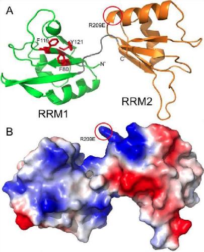 Figure 6. Homology modeling of Xenopus laevis Dnd1 suggests that only the N-terminal RRM domain is likely to bind RNA. A. Homology model of Dnd1 RRM domains is shown in a ribbon representation with RRM1 (residues 78-151) colored green and RRM2 (residues 158-233) colored orange. The linker between the two RRM domains is shown in grey, and the relative orientation between the two domains is likely variable and dependent on parts of Dnd1 not included in this model. RRM1 domain of Dnd1 has three aromatic residues (shown as red sticks) poised for stacking with RNA, while RRM2 has no aromatic side chains facing out from its beta sheet. Location of putative ATP binding on RRM2 is highlighted by a red circle. B. Homology model from panel A, shown as a molecular surface colored by electrostatic potential (red is acidic, blue is basic).