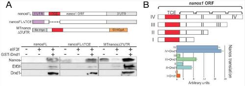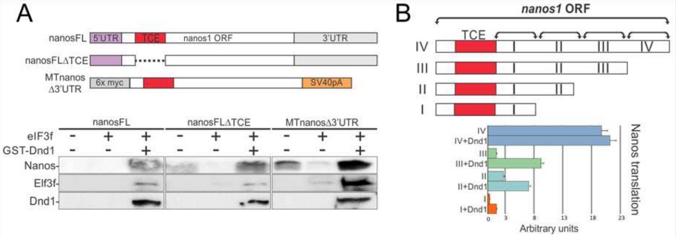 Figure 7. Dnd1 requires a region adjacent to the nanos1 TCE to promote nanos1 translation. A. Schematic of nanos1 deletions used in in vitro translation (WG) experiments shown below. WG extract was supplemented with 500 ng of nanos1 mRNA with or without purified Dnd1 protein and 1 ug of mRNA encoding the translational repressor eIF3f. Samples were analyzed for Nanos1, eIF3f and Dnd1 protein expression by western blotting. Experiments were repeated twice. Dnd1 protein promoted translation of each nanos1 mutant tested. B.Schematic of deletions within the nanos1 ORF downstream of the TCE (red box). Each transcript was tested for translation in the presence or absence of xDnd1 protein and eIF3f mRNA as shown in A. Results from blots are presented in the histogram. xDnd1 failed to promote nanos1 translation when region I (96 nt downstream of TCE) was deleted, suggesting that this region of nanos1 is required for Dnd1 function. Experiments were repeated twice using different wheat germ extracts.