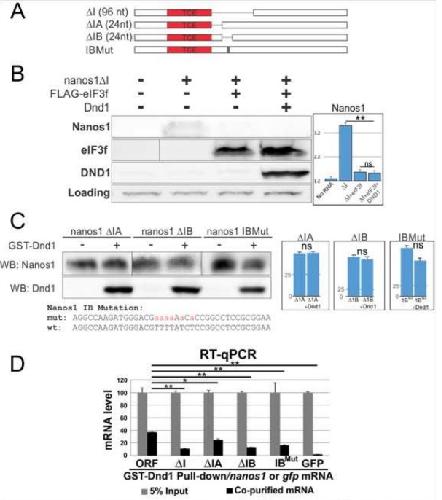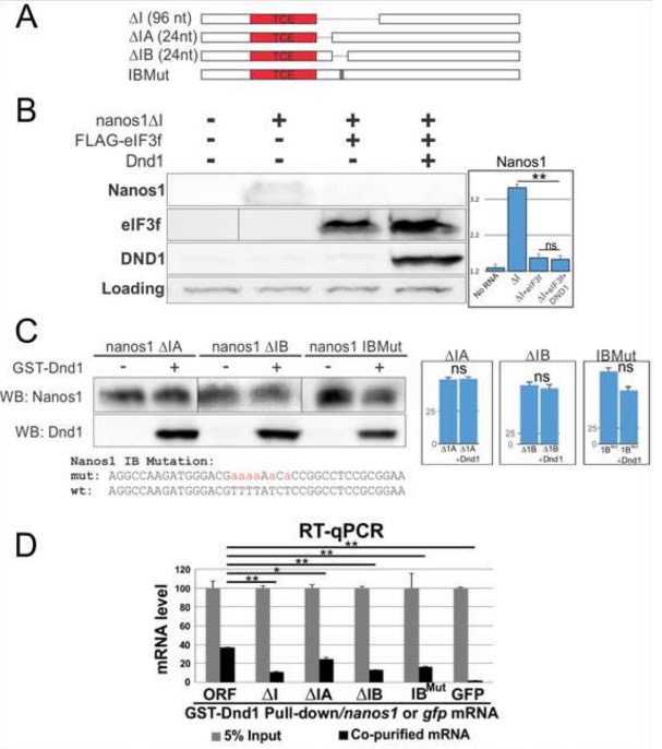 Figure 8. Dnd1 binds to TCE adjacent U-rich region of nanos1 mRNA. A. Diagram shows serial deletions of nanos1 mRNA used in in vitro translation and RIP assays. nanos1 ∆I region is missing 96 nt downstream of the TCE. Smaller deletions within region I were carried out (∆IA and ∆IB, 24 nt each). B. WG extracts were supplemented with either 500 pg of nanos1 mRNA with or without 1ug of translation repressor eIF3f and 100 pg of xDnd1 protein and analyzed by western blot. A non-specific band served as a loading control. The presence of Dnd1 protein did not promote the translation of nanos1 mRNA missing region I (∆I) after repression by eIF3f. Quantitation of blot shown on right. C. Wheat germ extracts with either 500 pg of nanos1∆IA/B or nanos1 region IB with mutations in U-rich sequence. mRNAs were incubated with or without Dnd1 protein and analyzed by western blotting. Dnd1 does not improve nanos1 translation. Quantitation of blot shown on right. Experiments repeated twice. D. RIP analysis. Different nanos1 mRNAs with deletion or mutation were pulled down by GST-Dnd1 and measured by qPCR. Ratio between the pulldown and 5% of RNA input is shown. GFP served as a negative control. All experiments were repeated at least twice. Quantification of results shown in B, C are shown as mean ± s.d. Two-tailed t-tests were performed. ** P<0.01; * P<0.05; ns: no significant difference.