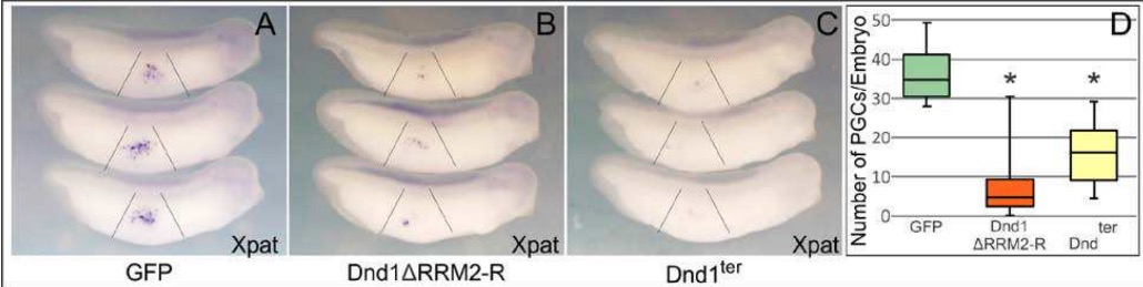 Figure 2. Overexpression of xDnd1ter or Dnd1 âRRM2-R results in loss of PGCs. A-C. One cell embryos were injected vegetally with 500pg of GFP (control) or the indicated dnd1 mRNA. Tailbud embryos (stage 32-35) were analyzed for Xpat expression by WISH. Representative images are shown. D. PGC number per embryo was quantified. GFP, n=16; Dnd1âRRM2-R, n=32; Dndter, n=16. *P<0.05, compared with GFP control. Analysis based on at least two independent experiments and shown as a box and whisker plot.
