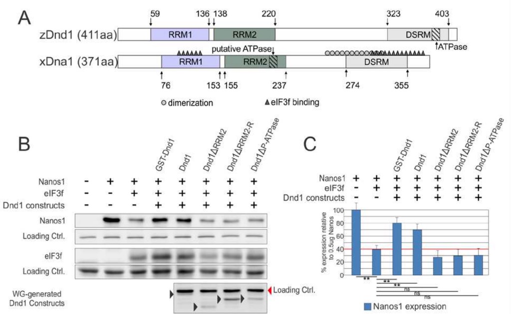 Figure 4. The putative xDnd1 ATPase site is required for nanos1 translation. A. Sequence alignment of Dnd1 orthologues from zebrafish and Xenopus. Both single-strand RNA binding domains (RRM1 and 2) are depicted in colored rectangles. The double-stranded RNA-binding motif (DSRM) is localized at the C-terminal domain. Regions involved in dimerization (grey o) (see Fig. 5), binding to the translational repressor factor eIF3f (black ∆) (see (Aguero, Jin, et al., 2017)) and the putative ATPase domain are indicated. B. Wheat germ extract was incubated with 500ng of nanos1 mRNA with (+) or without (-) 1ug of the translational repressor eIF3f mRNA. Either purified (GST-Dnd) or wheat germ generated Dnd1 proteins, wild-type or mutant, were also included (+). Sample extracts were analyzed by western blotting with anti-Nanos1, anti-eIF3f, and anti-Dnd antibodies. Experiments were repeated a minimum of 3 times each. C. Quantification of Nanos1 expression shown in (B) for indicated samples. Nanos1 expression is relative to the nanos1 mRNA only sample which is defined as the 100% level of Nanos1 expression.