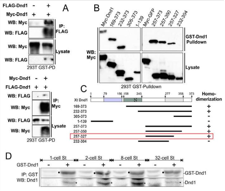 Figure 5. Dnd1 forms homodimers in vitro and in vivo. A. Co-IP shows the interaction between myc-Dnd1 and FLAG-Dnd1 in transfected HEK293T cells. Anti-FLAG (top panel) or anti-Myc (bottom panel) antibodies were used to pulldown xDnd1 from cell lysates. B. Different Myc-tagged Dnd1 deletion constructs were transfected into HEK293T cells, lysed and incubated with GST-xDnd1. Co-purified Dnd1 was detected by western blot analysis using anti-Myc antibodies. C. Schematic summarizing experiments shown in (B). “+” for Dnd1 homodimerization; “-” lack of Dnd1 dimerization. Red rectangle highlights the smallest xDnd1 region required for homodimerization (see also Fig. 4A). Analysis based on at least two independent experiments. D. Dnd1 dimerizes in vivo. Extract from 50 1-, 2- 8- and 32-cell stage Xenopus embryos were made and incubated with GST-xDnd1 purified protein. Anti-GST antibody was used to pull down GST-xDnd1 and xDnd1 proteins were detected by western blotting using anti-xDnd antibody. Endogenous xDnd1 bands are indicated by asterisks, exogenous pulled-down GST-xDnd1 bands are indicated with black dots. Negative controls have a weak non-specific protein that migrates similarly to GST-xDnd1 protein. This experiment was repeated twice using embryos from four different females