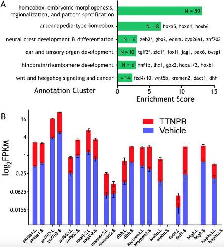 µM TTNPB-treated embryos (q<0.05, FPKMVEH>0.1) conducted in DAVID (Huang da et al., 2009a, b). Gene symbols from Xenopus were used as input, and GO terms were derived from human (for better annotation). Enrichment score is measured by Fisher's exact statistics by the DAVID server. *zic1 is a downregulated gene, and zeb2, tgif2 are <1.5-fold activated by TTNPB. (B) TTNPB-induced genes selected for further analysis in mesoderm development. Activation by TTNPB (represented as log2FPKM) is mapped for both .L and .S subgenomes (Matsuda et al., 2015; Session et al., 2016). kielin and btg2 are not found in .S and .L, respectively; hapln.S is not detected by RNA-seq. |