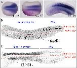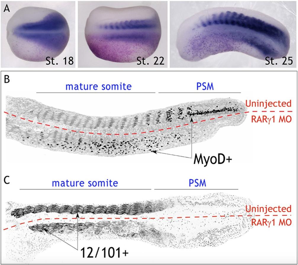 ng RARγ1.L/S MOs lead to reduced Myod mRNA expression (10/14 embryos, dorsal view). (B) RARγ1 MOs cause loss of PSM expression of Myod protein and ectopic expression in the trunk of coronal sections of stage 26 embryos (4/4 embryos). (C) RARγ1 MOs cause loss and disorganization of mature somite marker 12/101 in coronal sections of stage 26 embryos (4/4 embryos). |